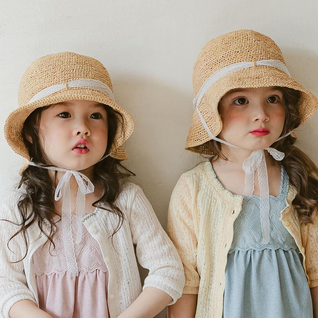 トーションレースをあご下で結べば風に飛ばされる心配もなく