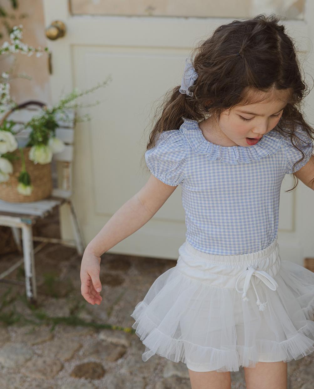 ネックラインにはフリルをあしらい、首元にさりげない華やかさをプラス。