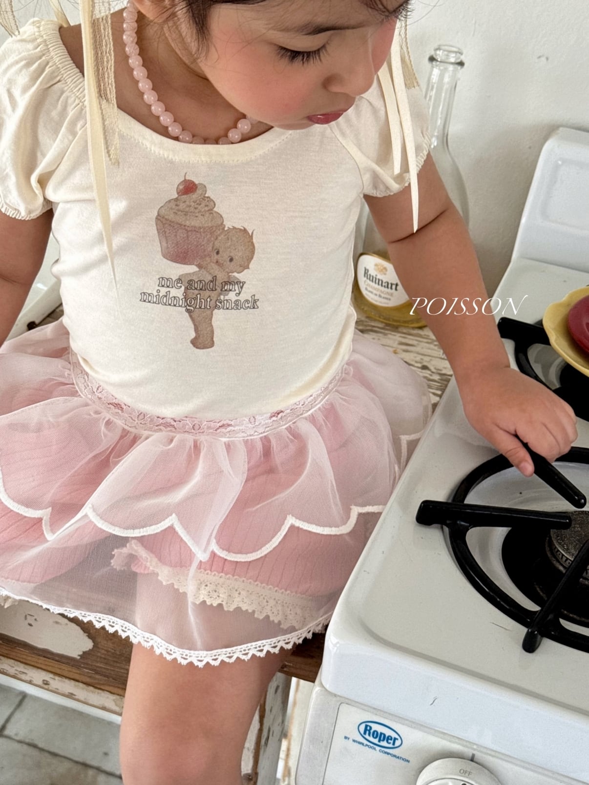 裾にあしらわれた繊細なレースが、女の子らしい可愛らしさを引き立てます。