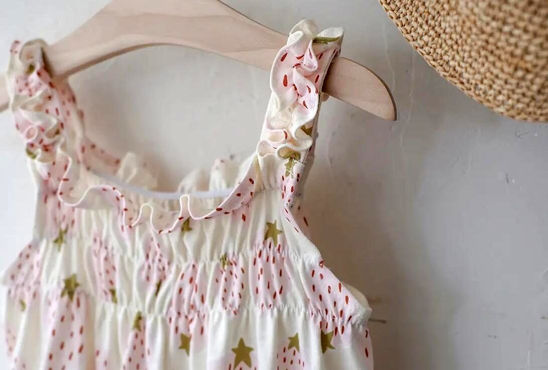 甘くて可愛いイチゴのイラスト生地を使ったコットン素材のジャンプスーツです。