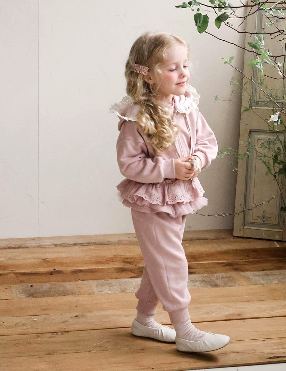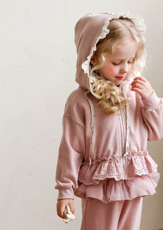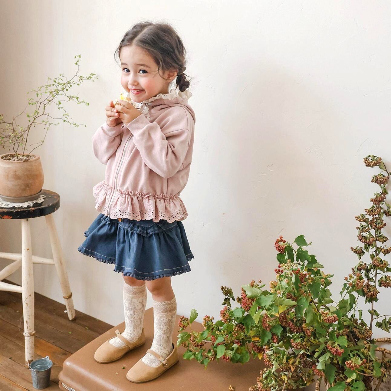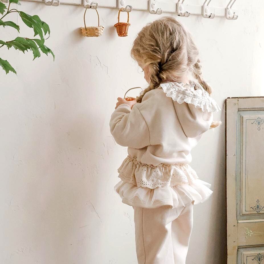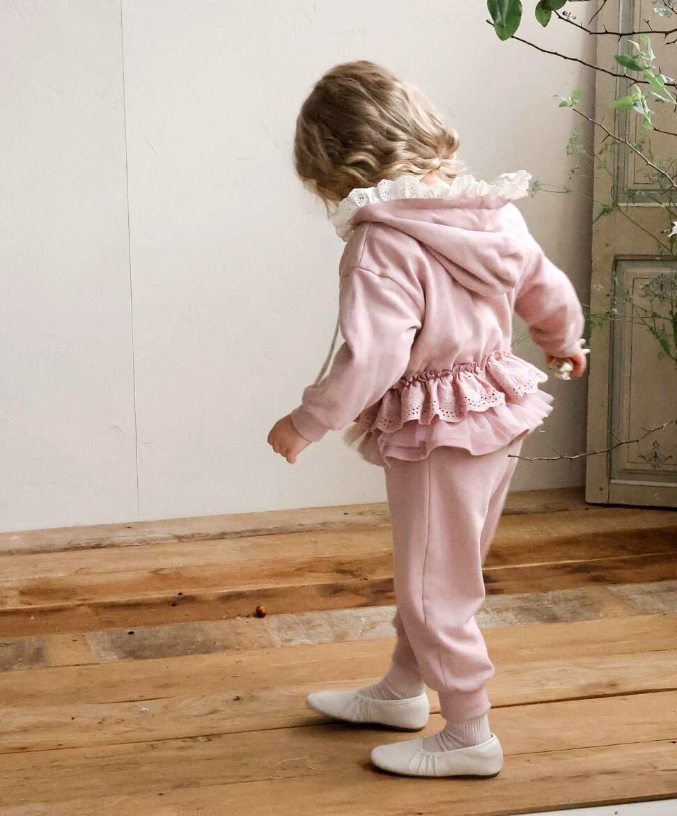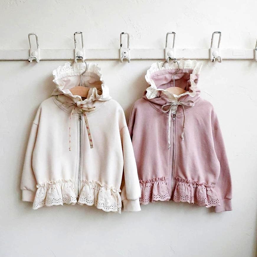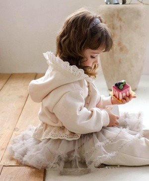 なめらかな素材感とコットンレースのフリルデザインが上品な印象のパーカーです。