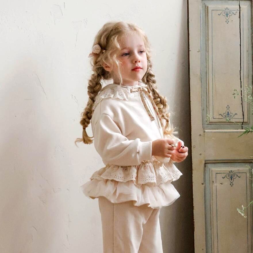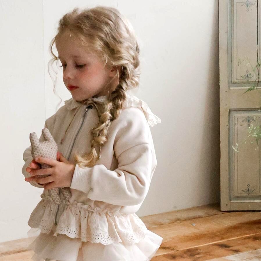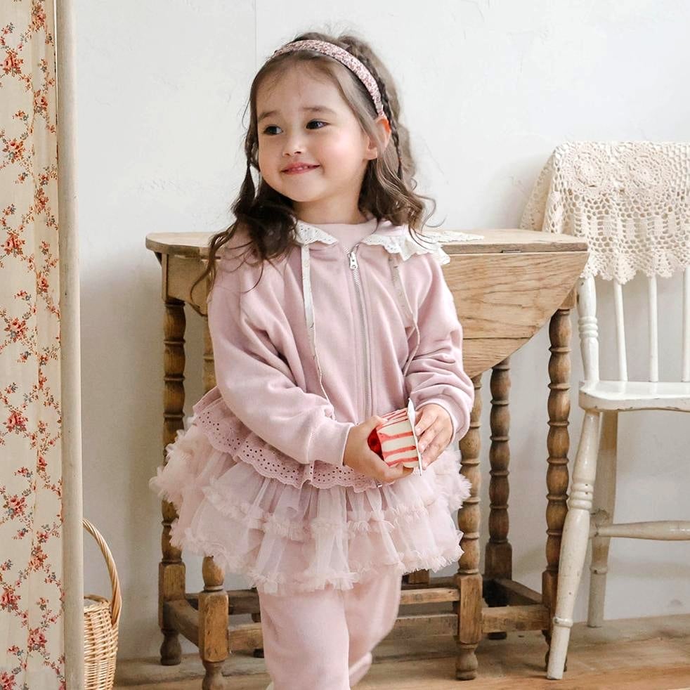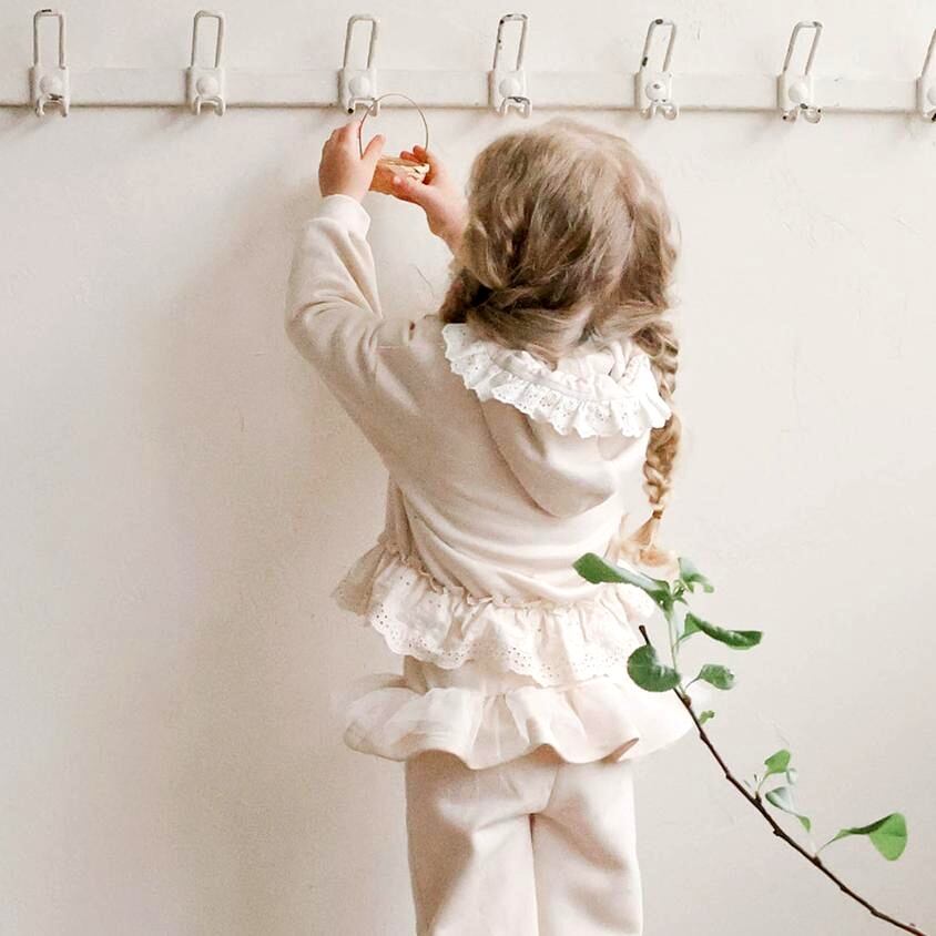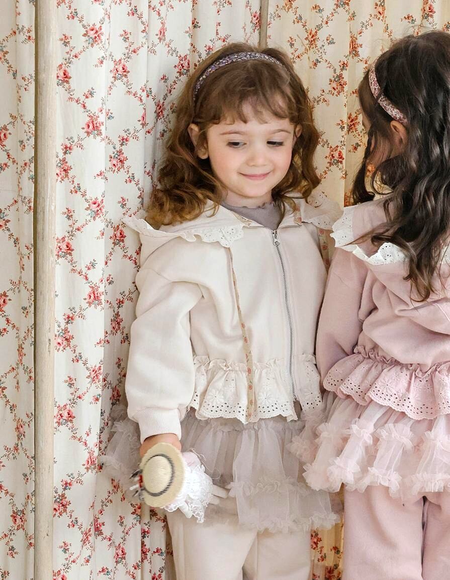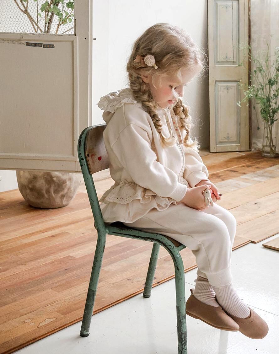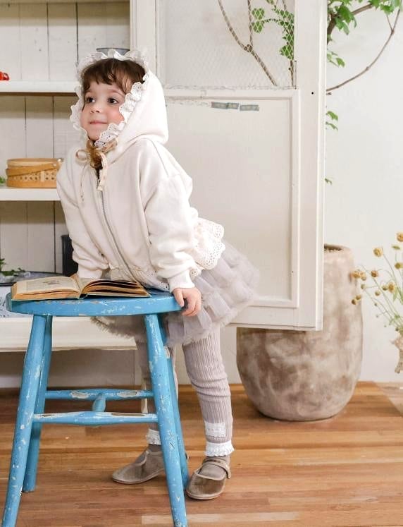 なめらかな素材感とコットンレースのフリルデザインが上品な印象のパーカーです。
