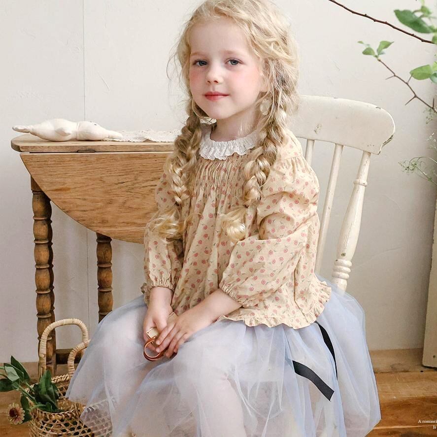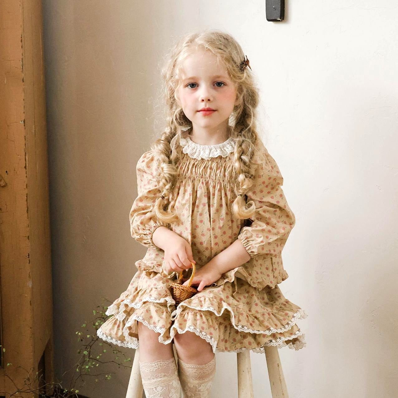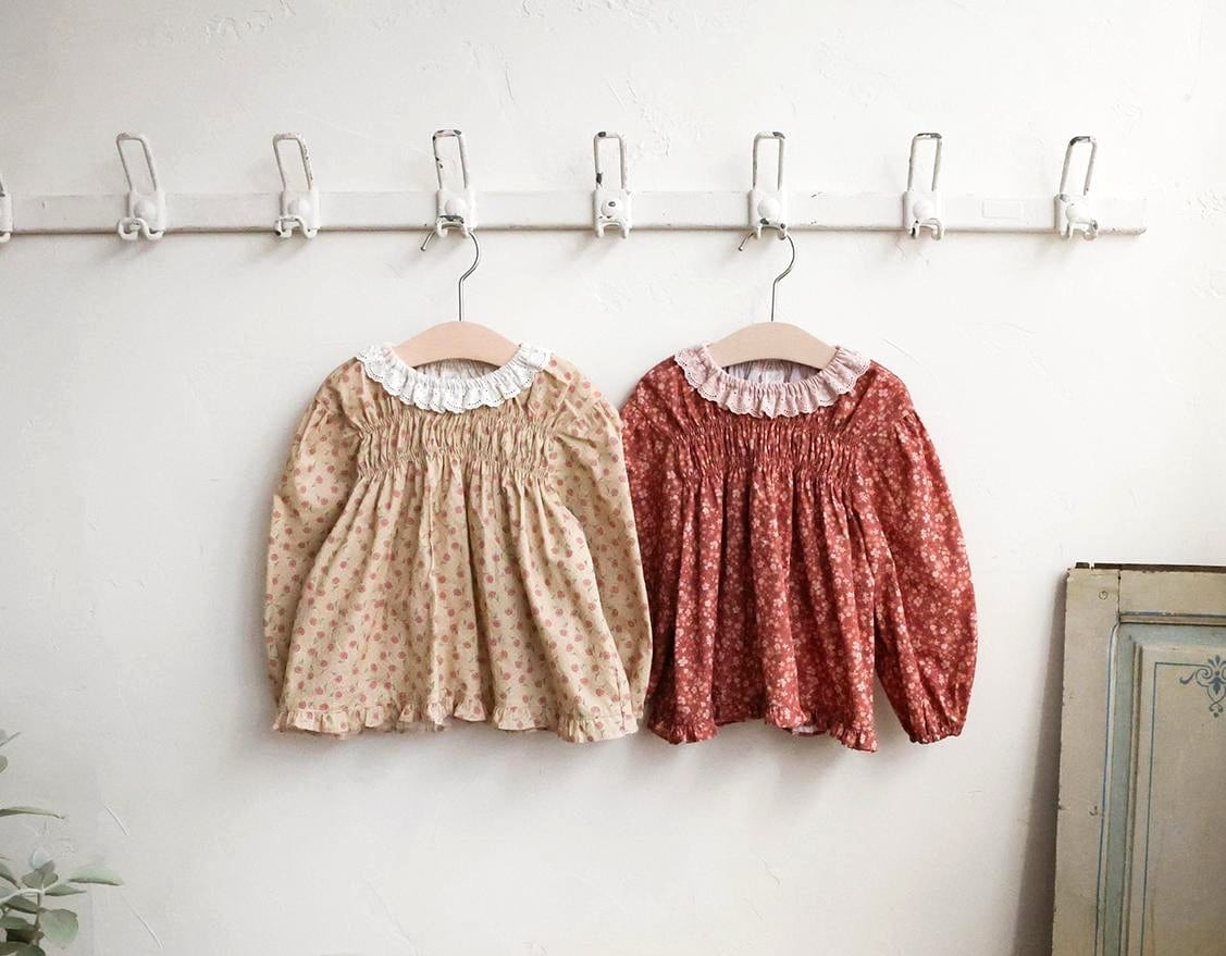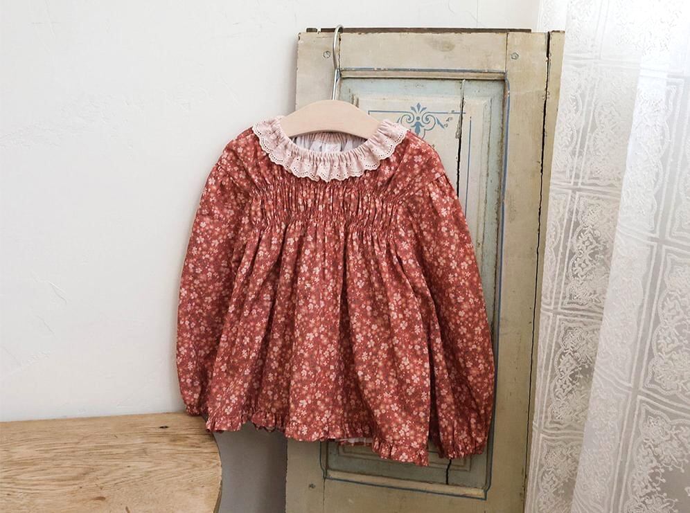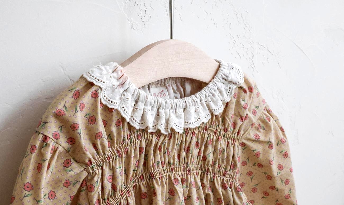 花柄のコットン素材をベースにスモックレースが全体の雰囲気を格上げしてくれます。