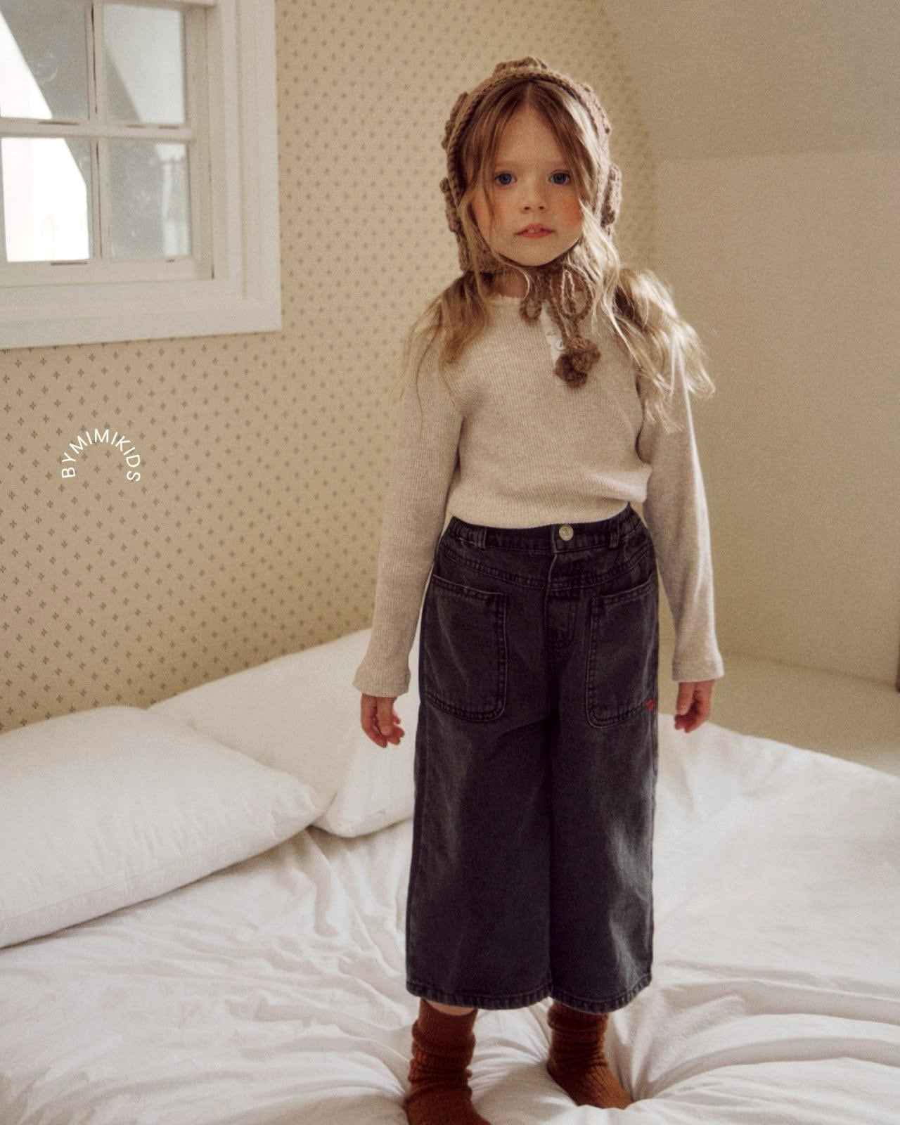 コットンデニム100%生地でワイドシルエットが可愛いデニムパンツです。