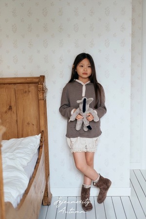 薄手のコーデュロイ生地にレースをあしらい手刺繍のようなフルーツモチーフの刺繍をプラスしてより愛らしい仕上がりになっています。