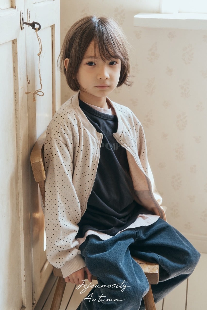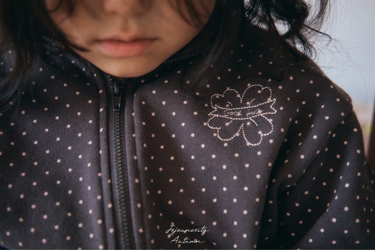 程よい厚みの素材にさりげないドット柄をあしらった可愛らしいジップアップジャケットです。