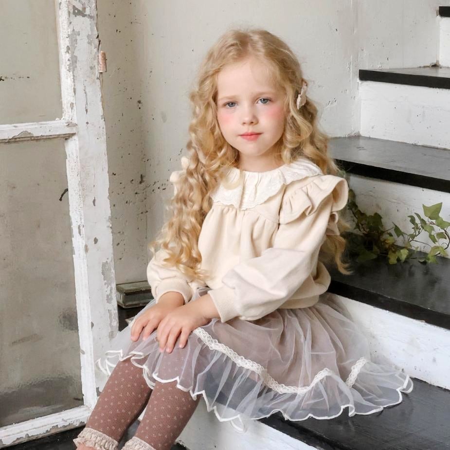 レース襟と肩のフリルが愛らしいアクセントになったガーリーなスウェットです。