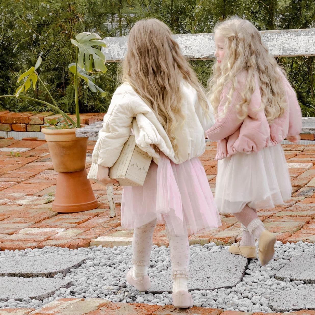 スカートは裾広がりなチュールのシルエットが、女の子らしい雰囲気を着こなしに演出します。
