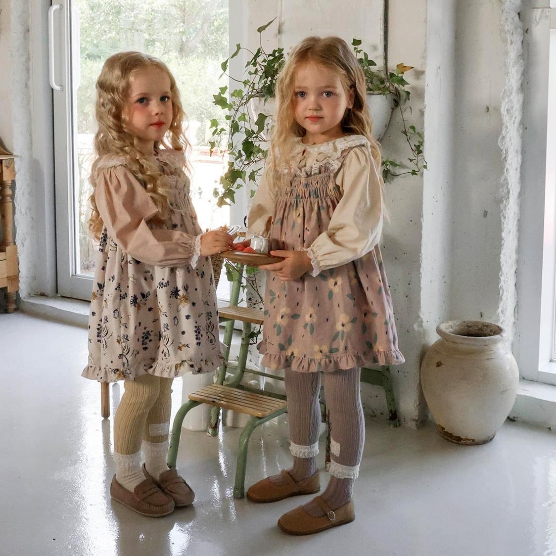 温かみのあるコーデュロイ素材で仕立てた花柄ワンピースです。