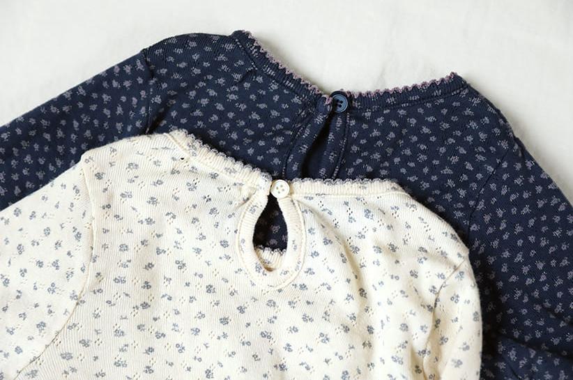 柔らかなコットンアイレットリブ素材で仕立てた繊細な小花柄が可愛らしいトップスです。
