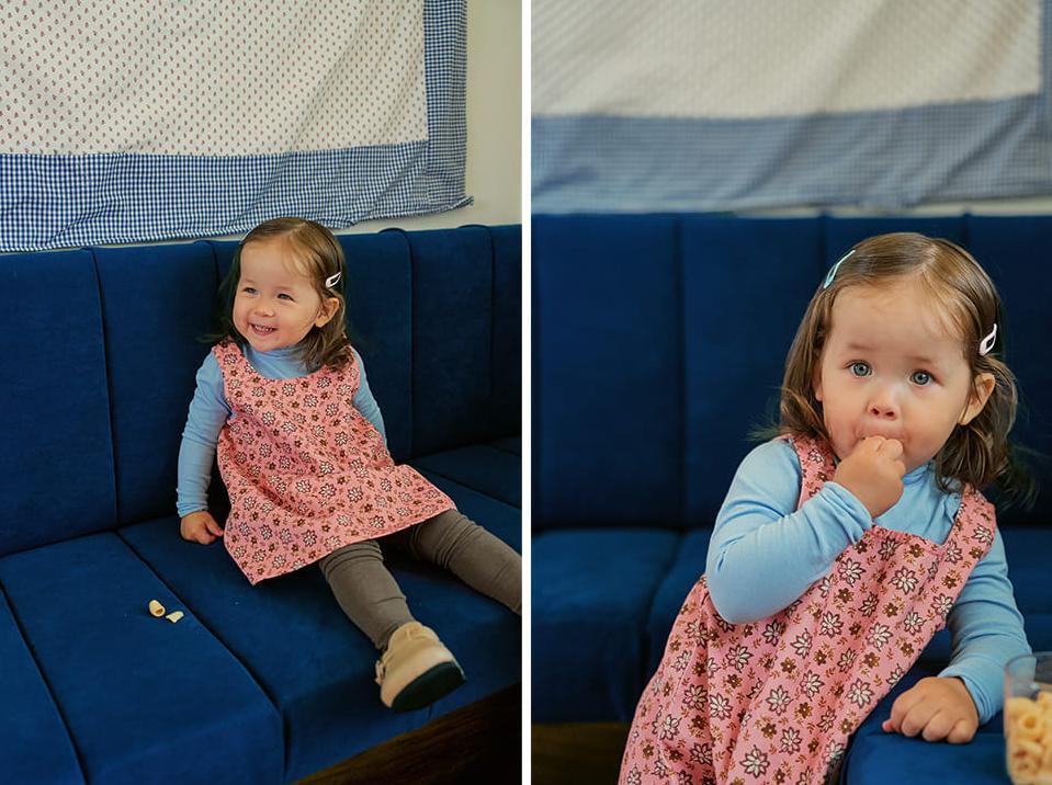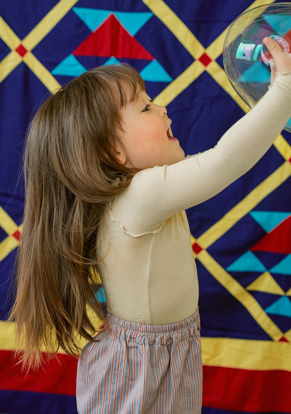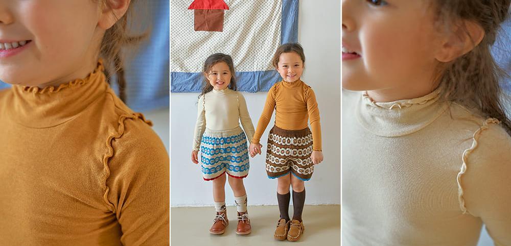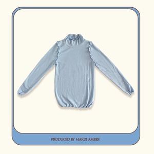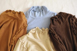 襟元や袖口、アームホールにはぷくぷくとした愛らしいメロウ仕上げを施しシンプルな中にも華やかさを添えています。