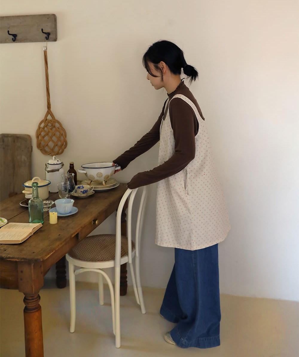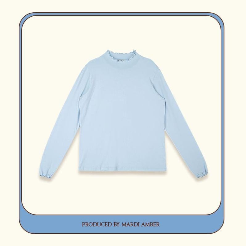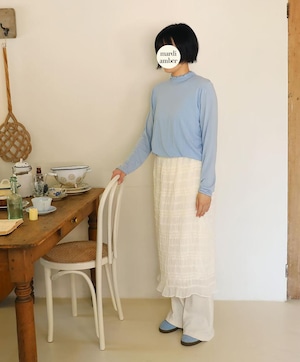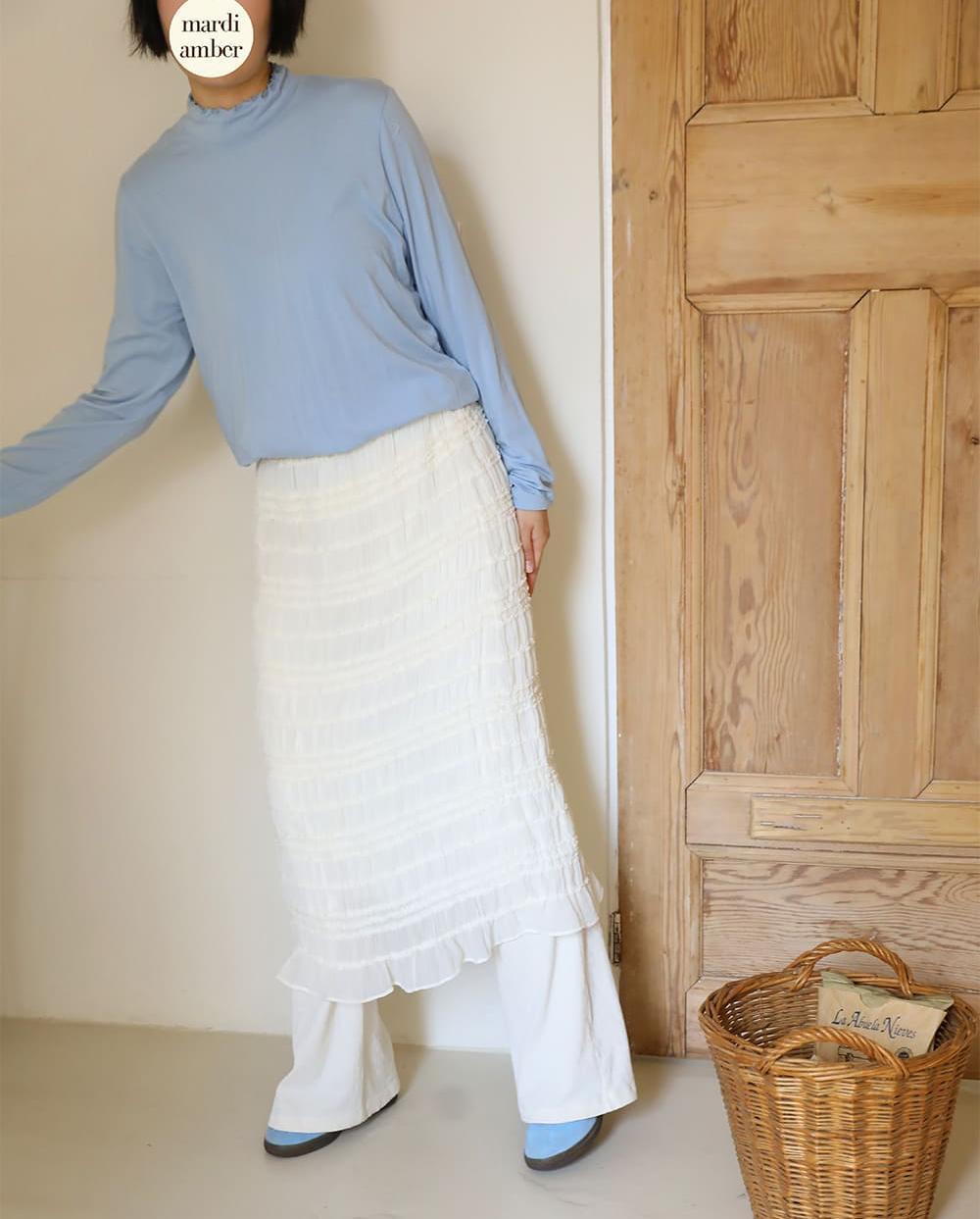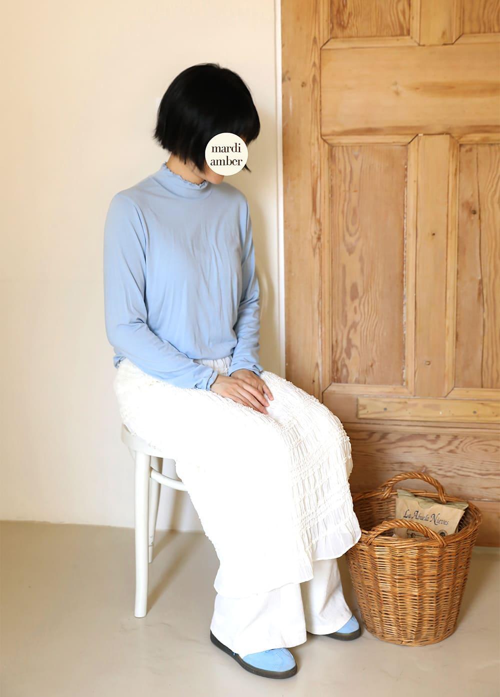 ほんのり立ち上がるネックラインは首元をすっきりと見せてくれ、袖口にはさりげない波打つようなメロウ仕上げをプラス。