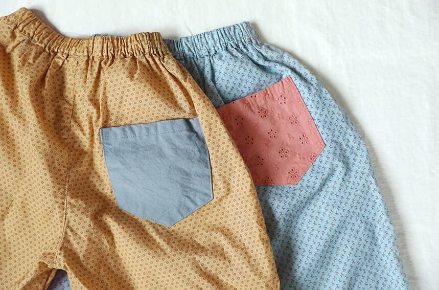 後ろには配色生地のポケットをあしらいデザインのアクセントにしました。