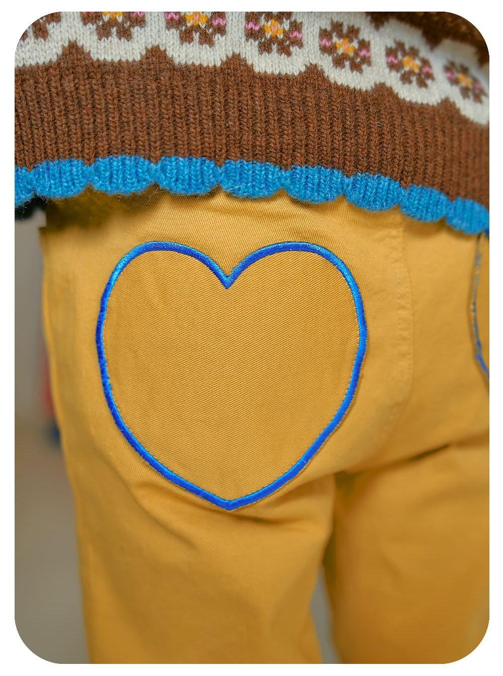 後ろにはハート刺繍のポケットを施し後ろ姿まで可愛らしく仕上げました。