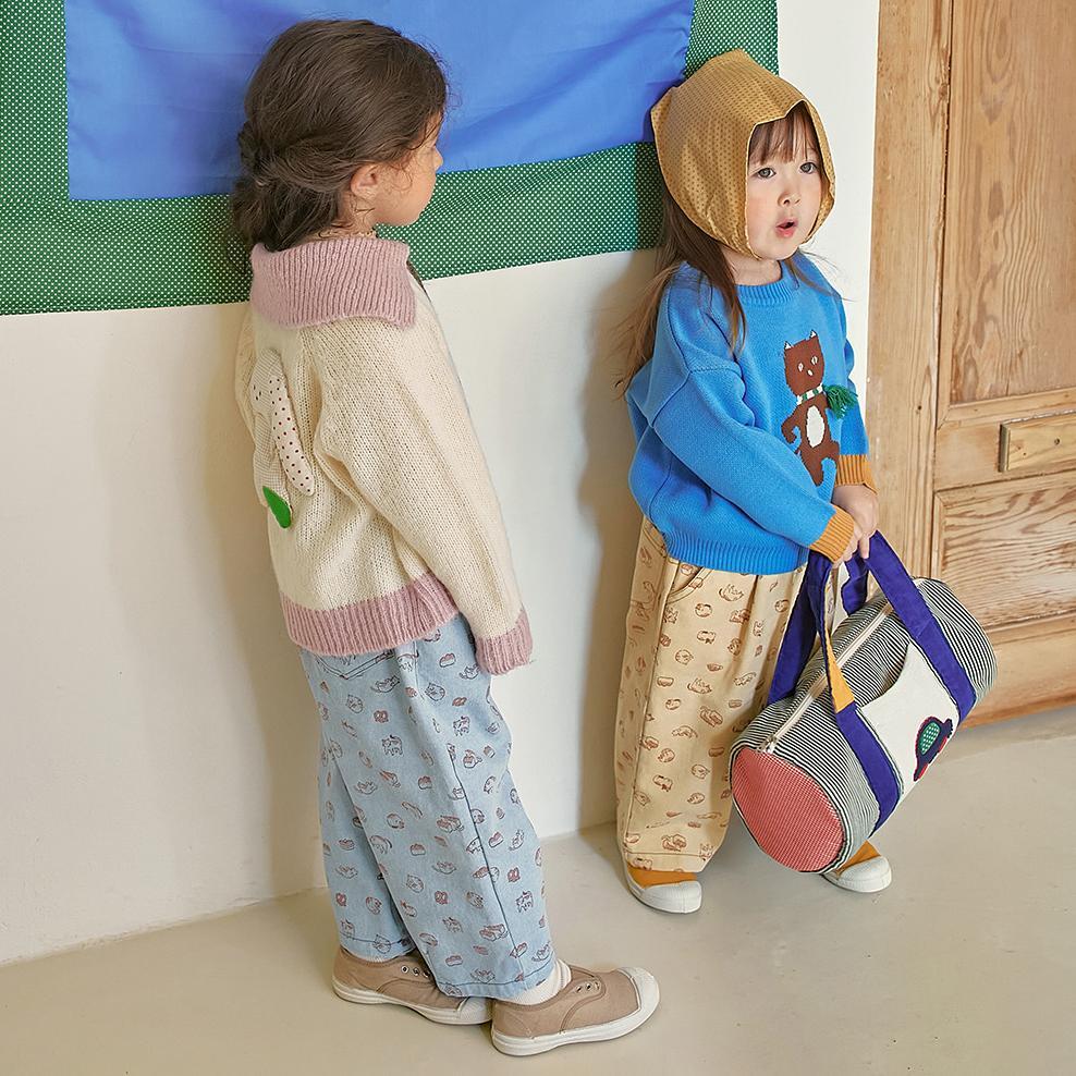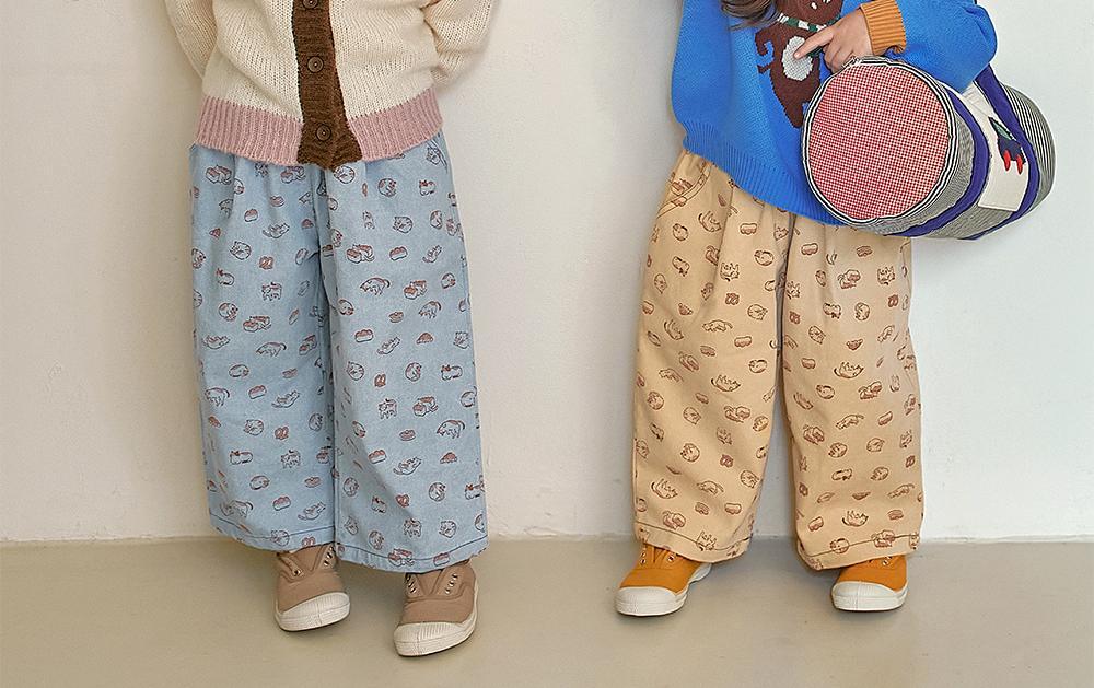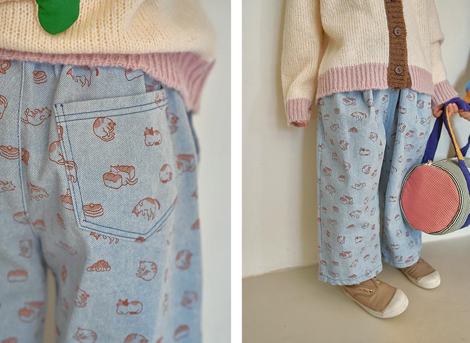 可愛らしい猫のイラストがキュートなワイドパンツです。