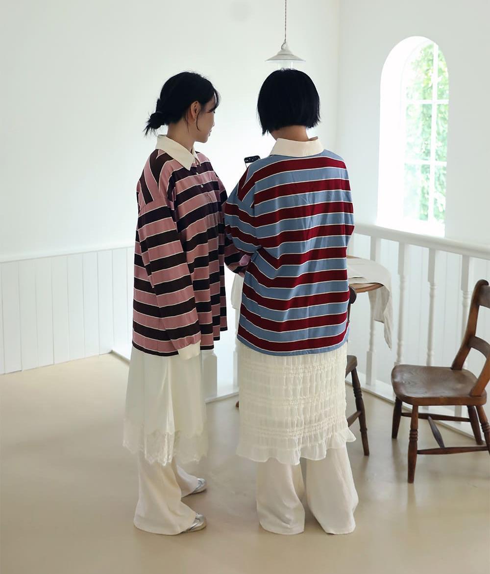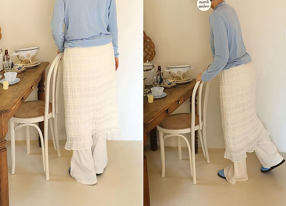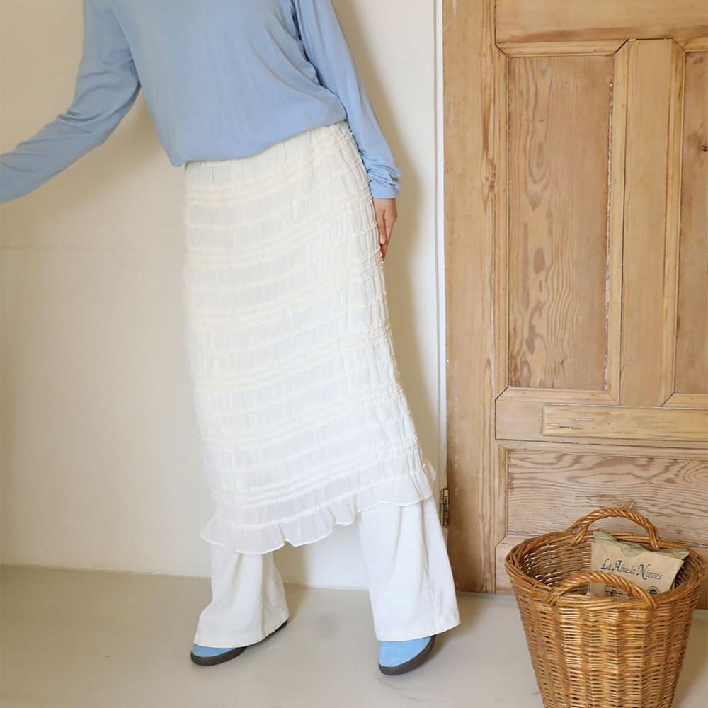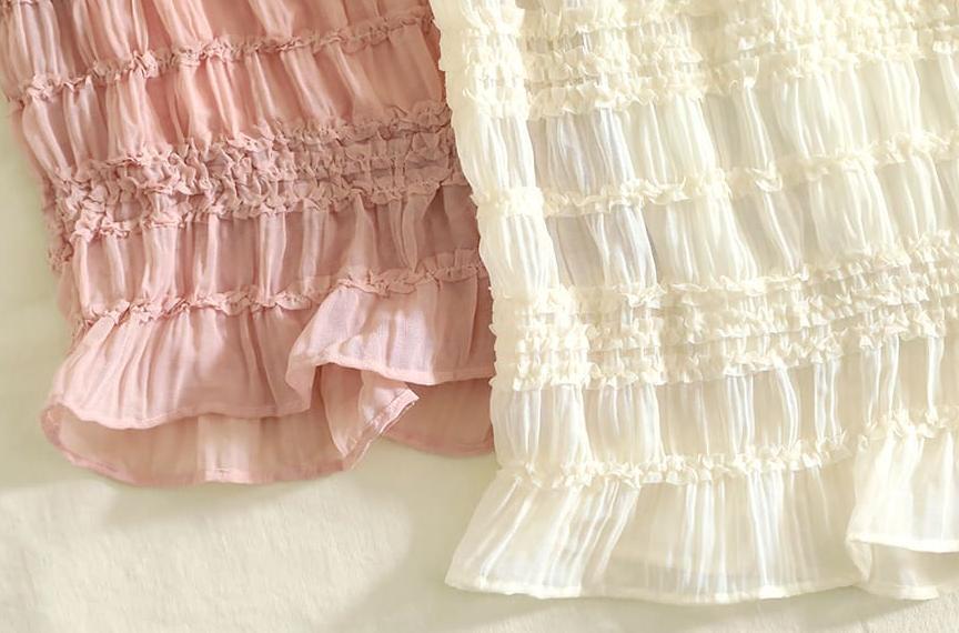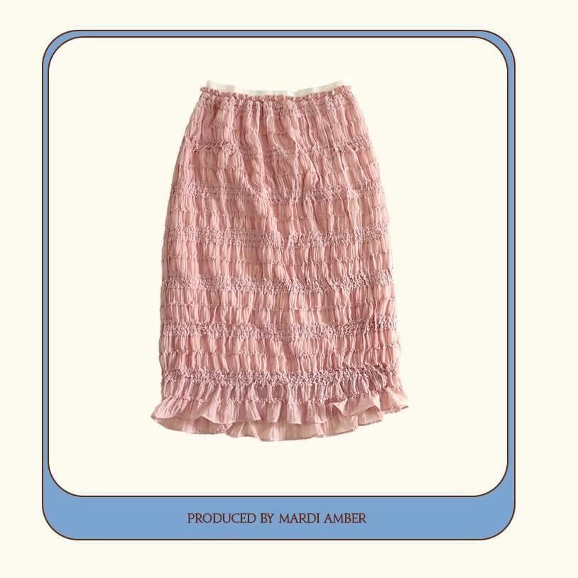やわらかなクリームカラーとかわいらしいピンクカラーのフリル素材で仕立て、ふんわりしながらも広がりすぎないフレアラインのロング丈に仕上げました。