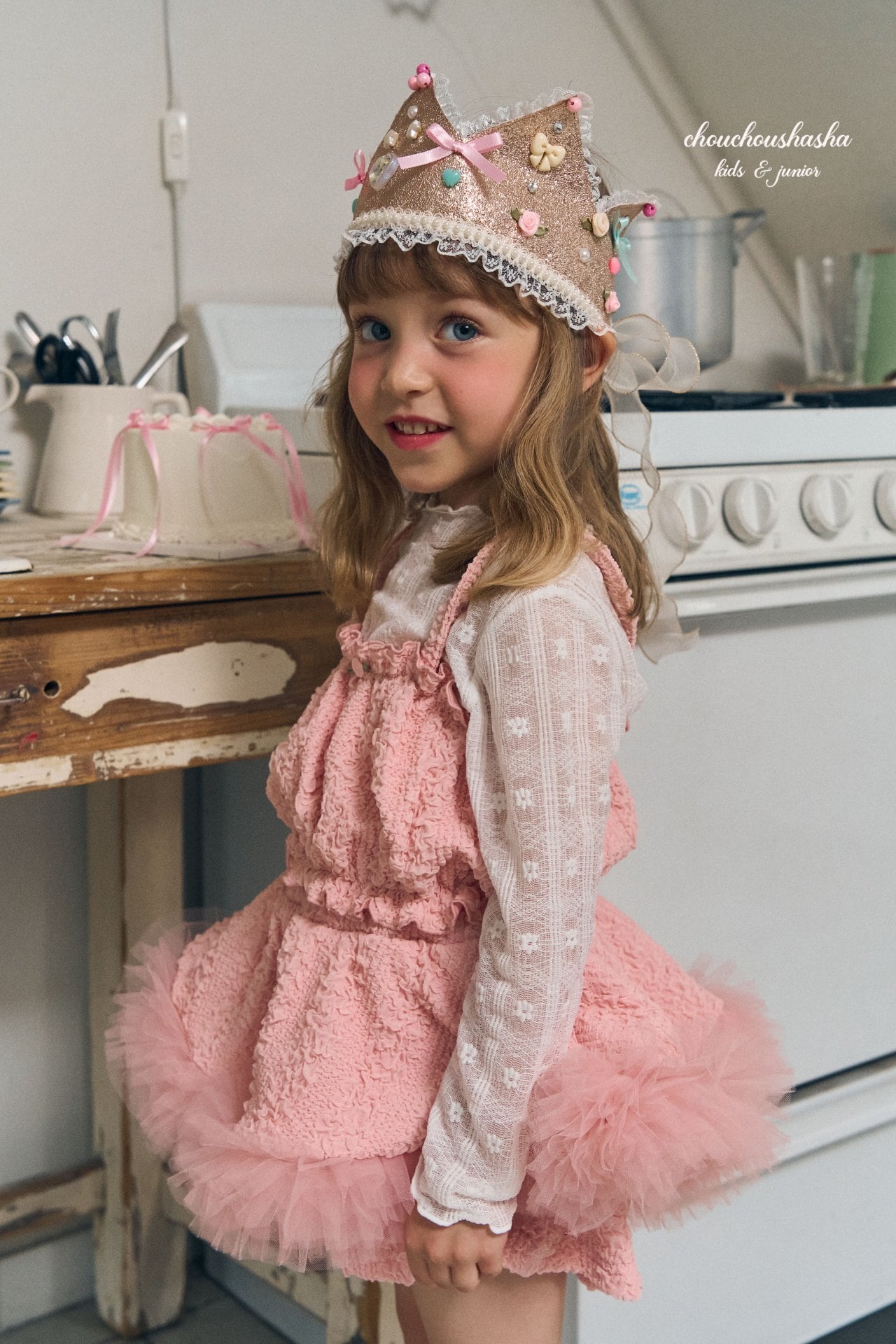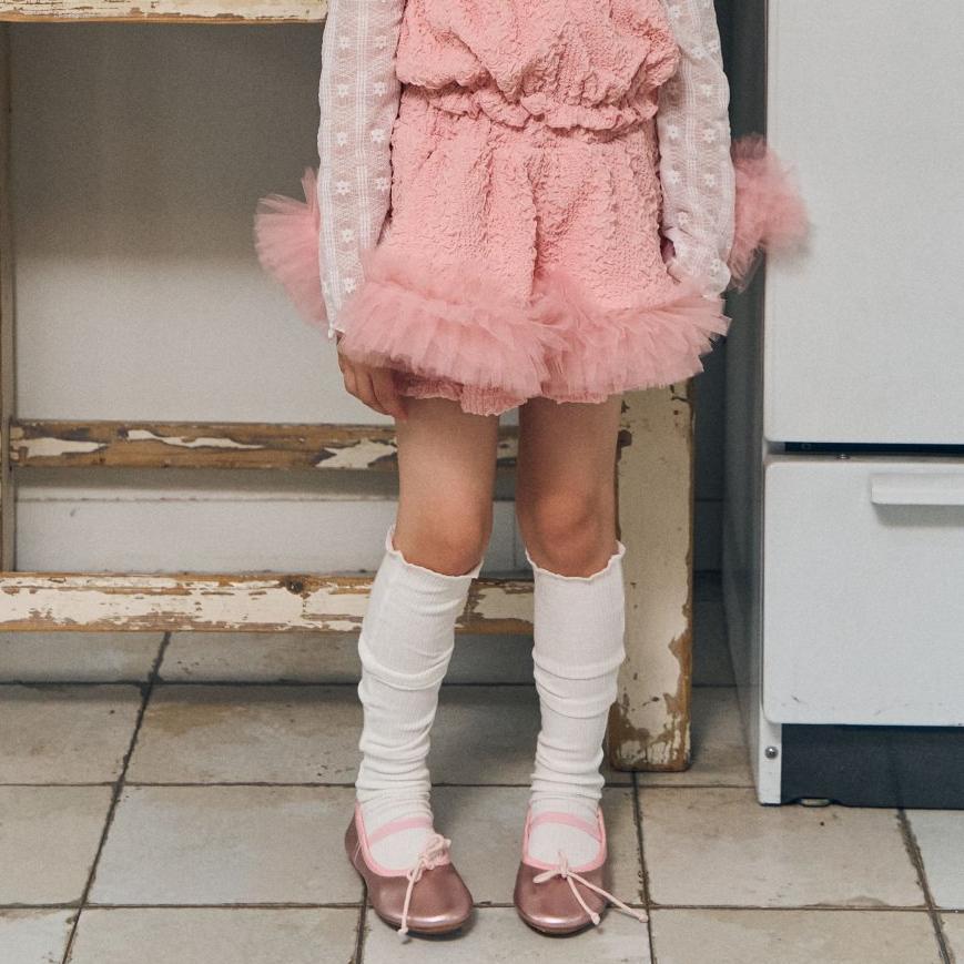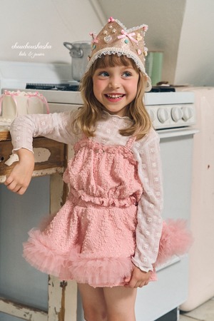 パンツの上にスカートを重ねたレイヤードデザインで、スカート部分の下にはふんわりとしたチュールを全体にあしらい、華やかなボリューム感を演出しました。