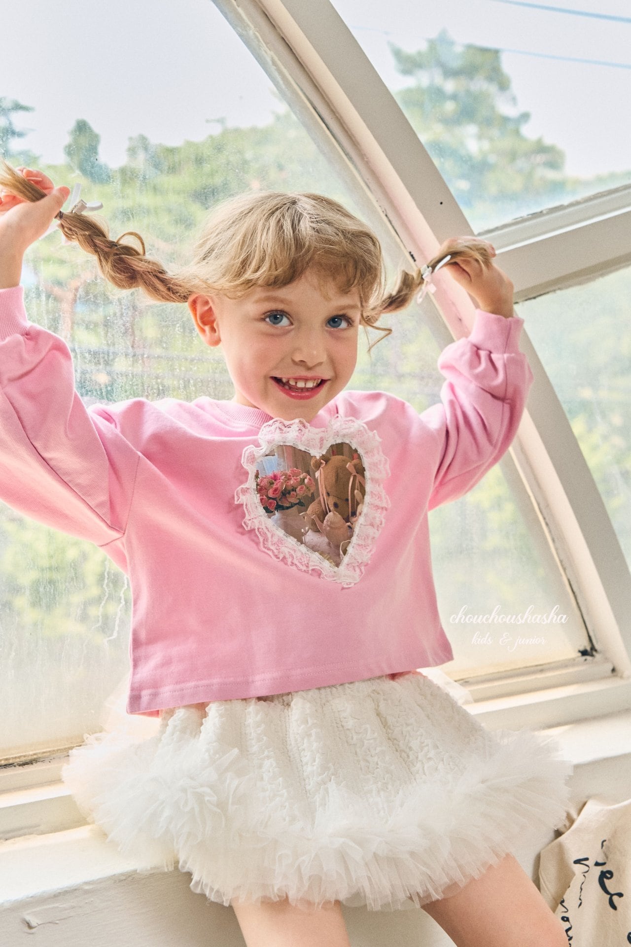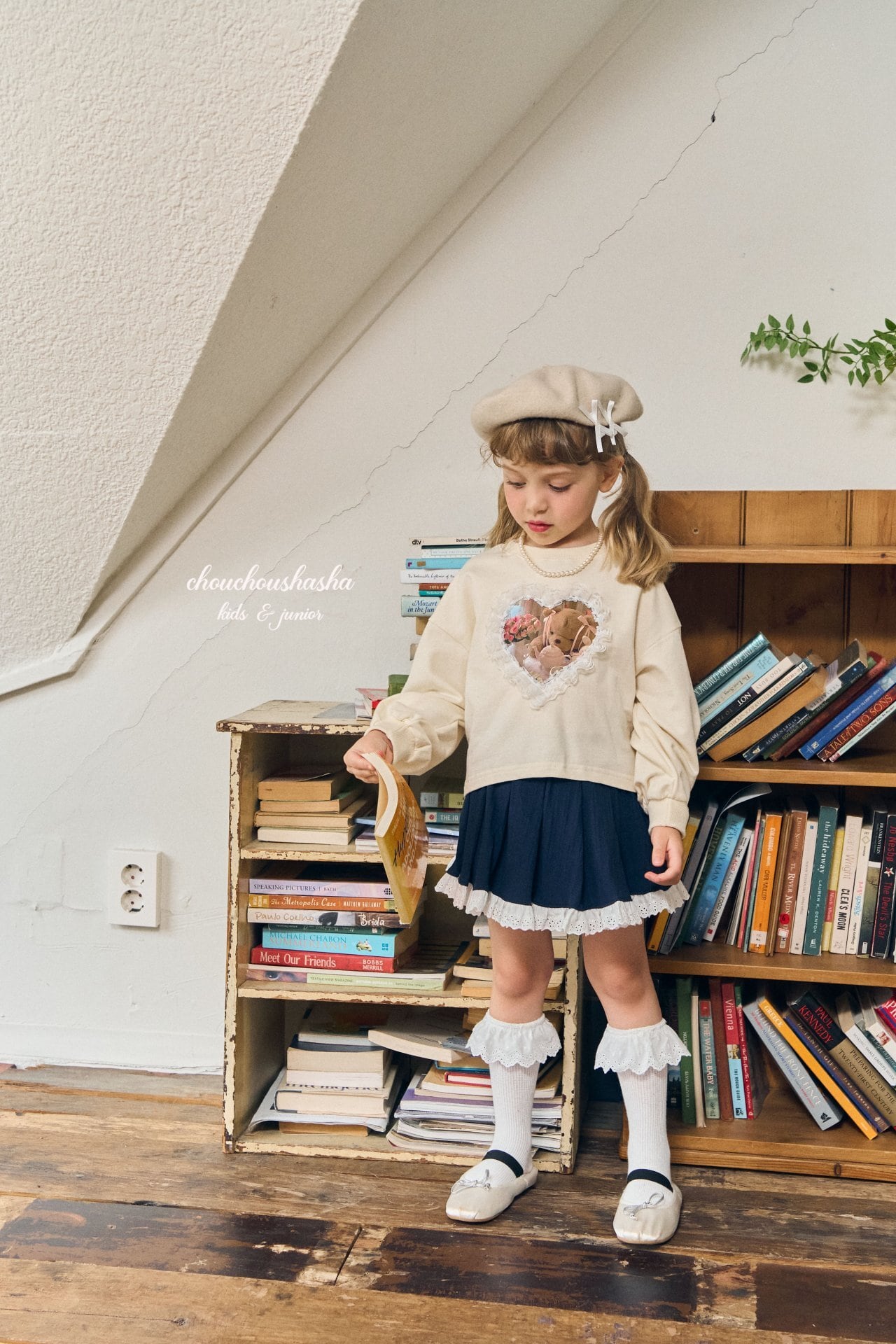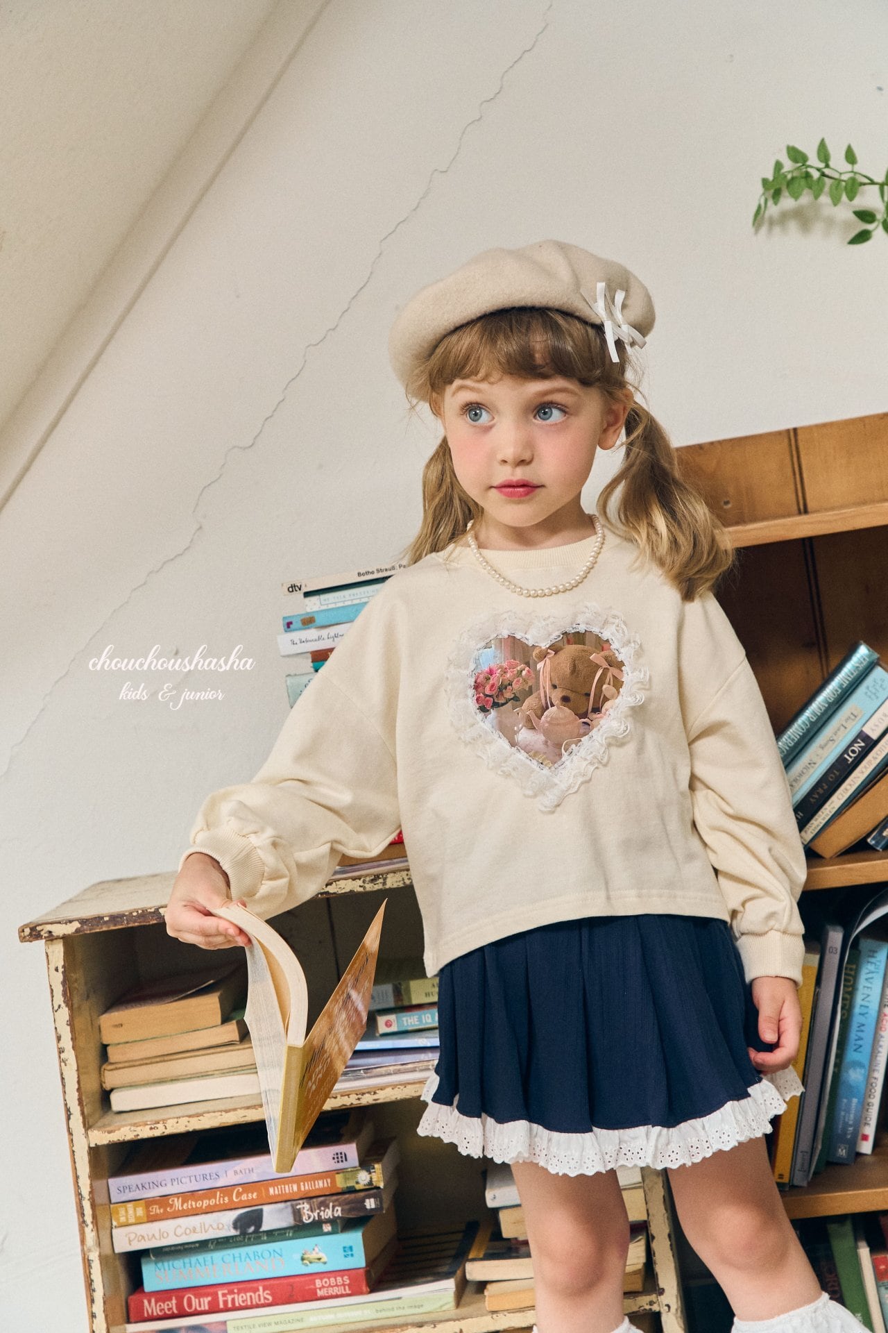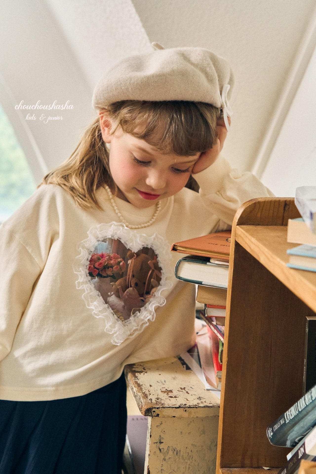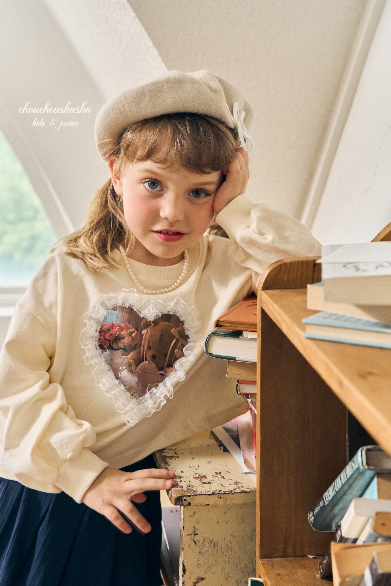 胸元にはティーパーティーを楽しむ可愛らしいくまのプリントをあしらい、プリントのハートラインに沿ったギャザーレースが愛らしさをさらに引き立てます。