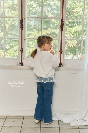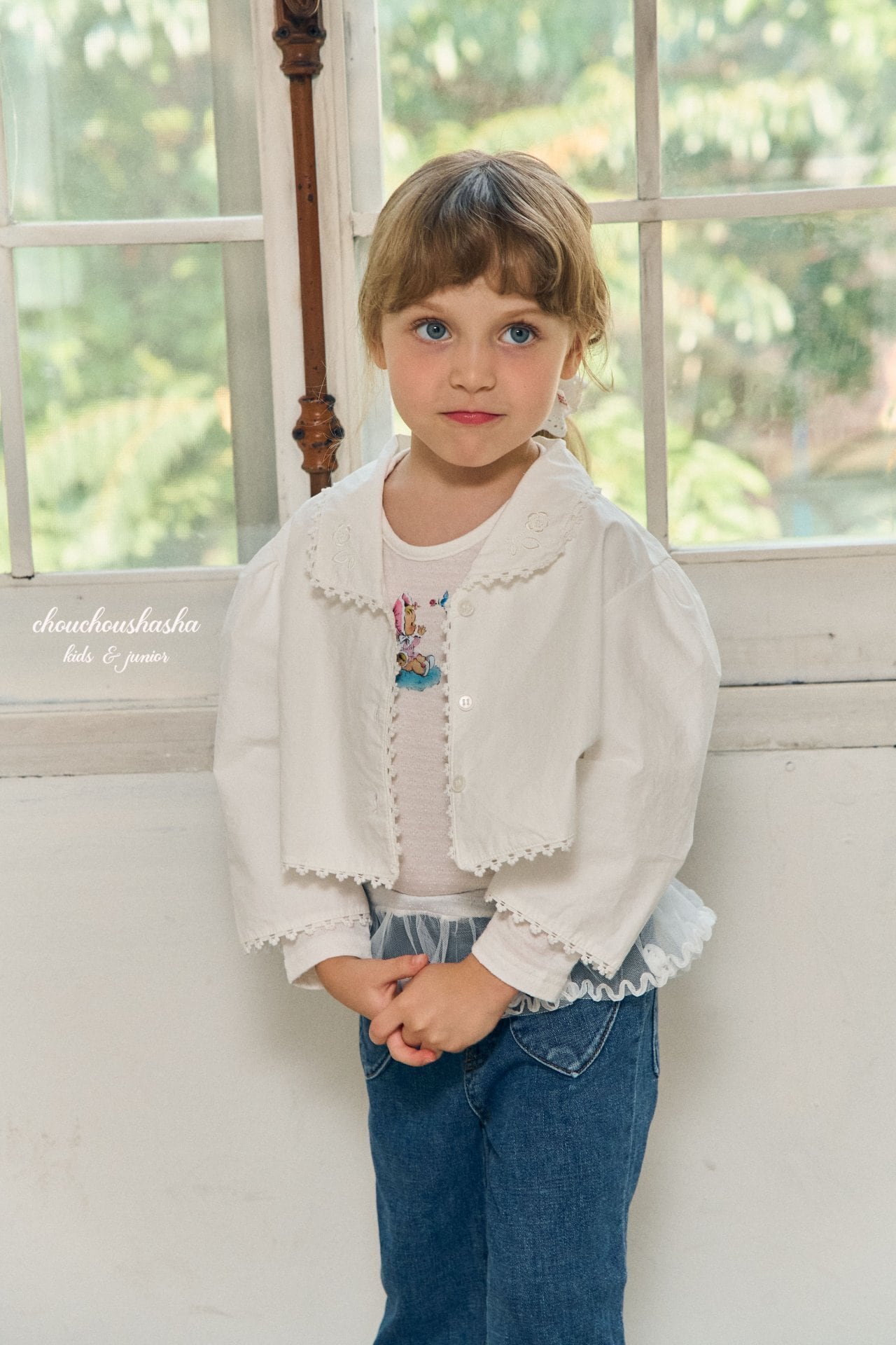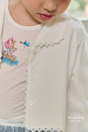 襟元にはフラワー刺繍をあしらい、全体のラインにはトーションレースでアクセントを添え、繊細で可愛らしい印象に仕上げました。