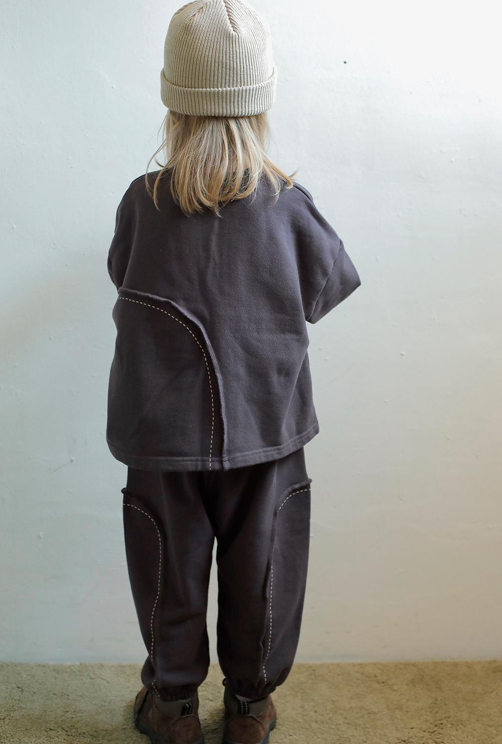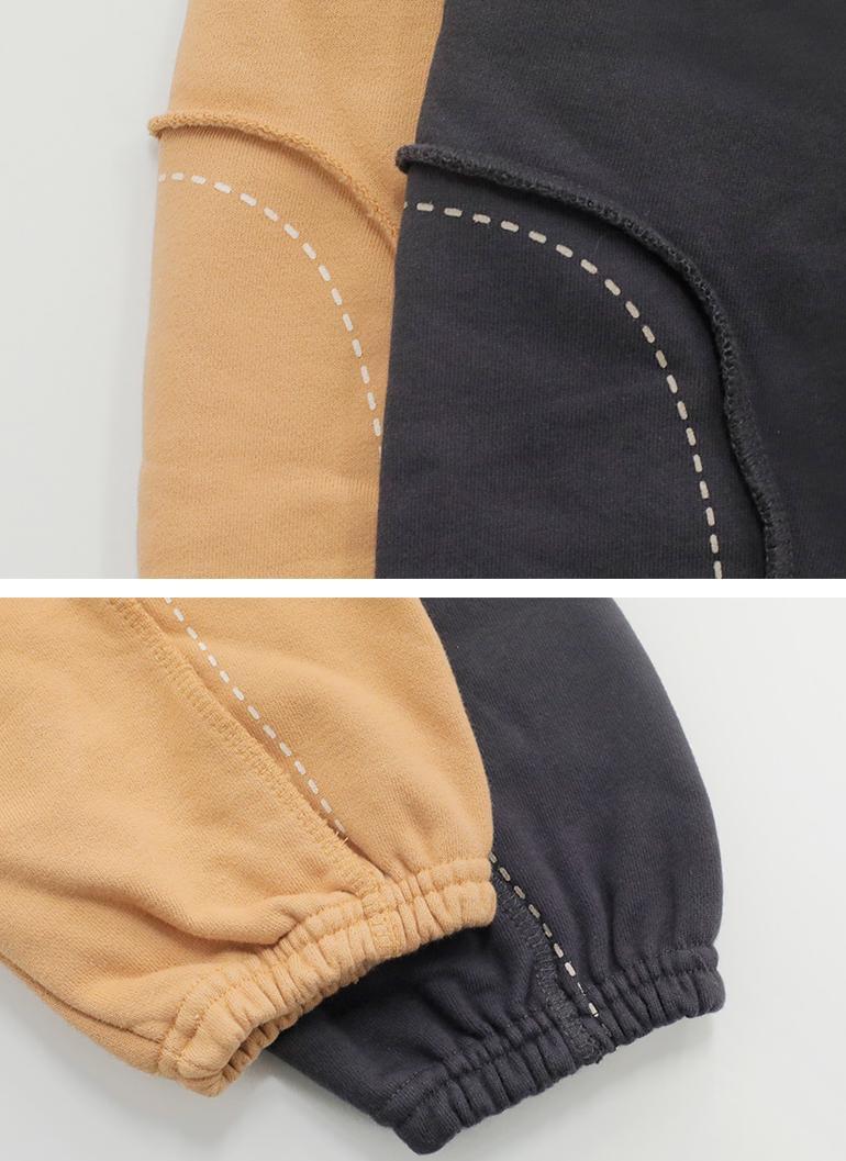 外側に出した縫い代の切り替えラインとステッチプリントが個性あるアクセントとなりカジュアルなスタイルにさりげない特別感をプラスしてくれます。