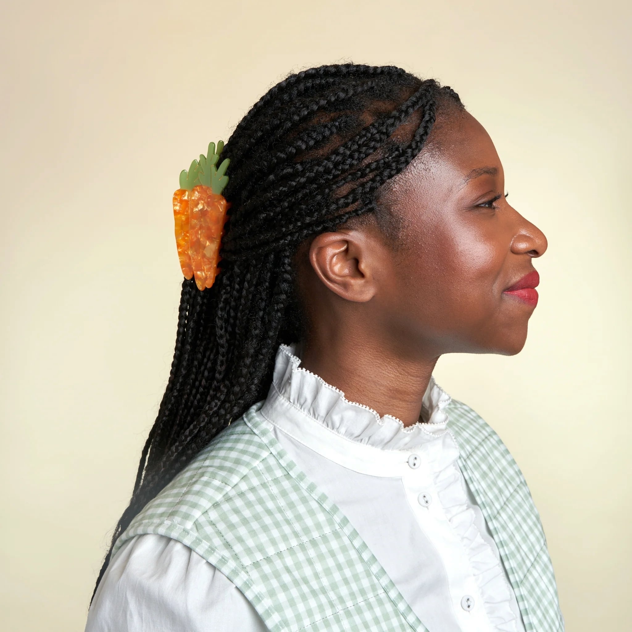 Calling all lovers of crunchy veggies — meet our delightful Carrot hair claw clip! Three neatly bundled carrots, leafy tops blowing in the breeze, ready to tame your messy buns and half-up styles with flair. We’re obsessed with its bold, graphic design and vibrant orange hue that shimmers with every movement. A fun and fresh vegetable hair accessory that adds a juicy pop of color to any hairstyle.
