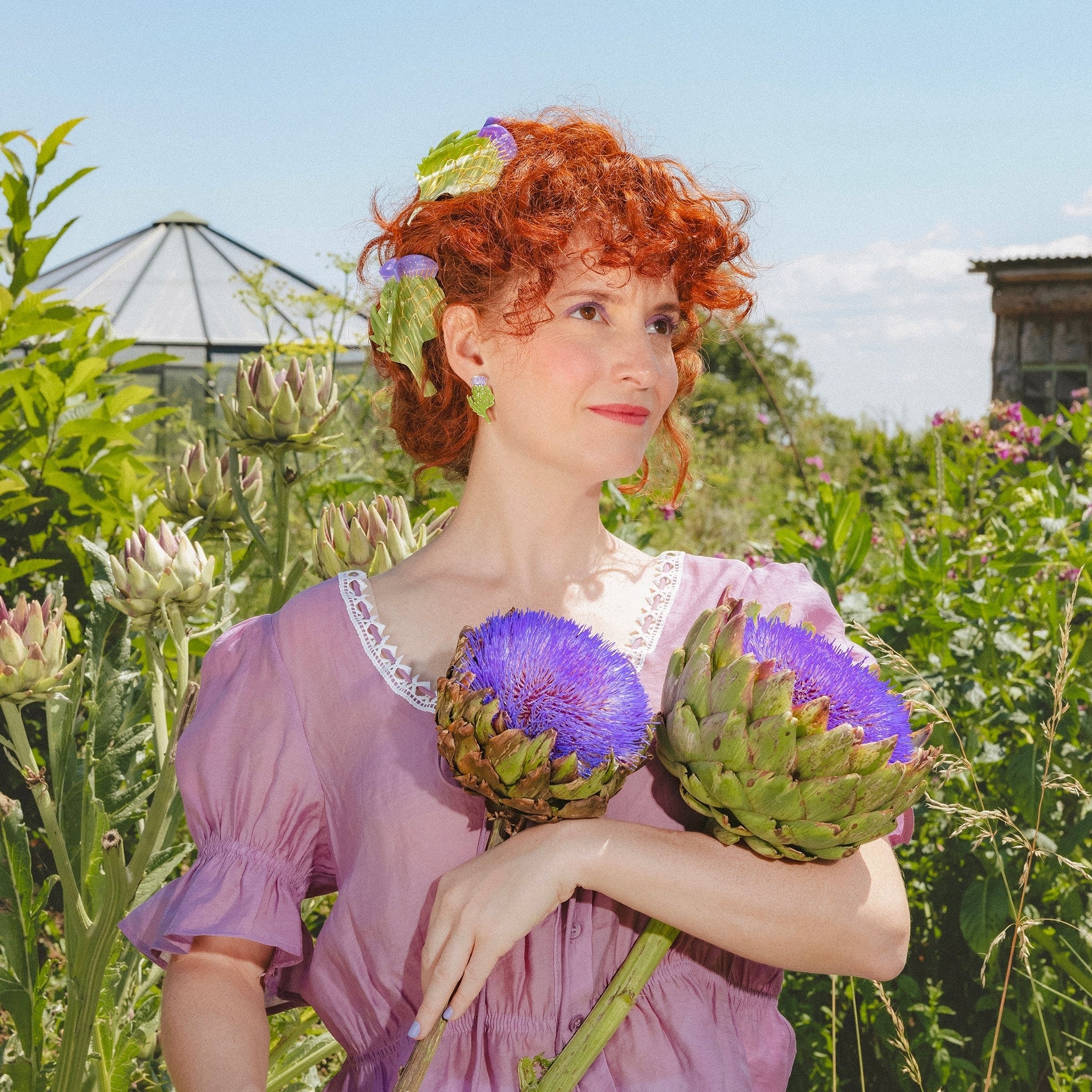 We just can’t stop dreaming up the wildest hair claws — and here comes our incredible artichoke flower clip! A gorgeous veggie in pearly green acetate, crowned with a stunning purple bloom that could charm a whole swarm of bees. A quirky, feel-good vegetable hair accessory that brings back memories of the best springtime lunches. Yum!