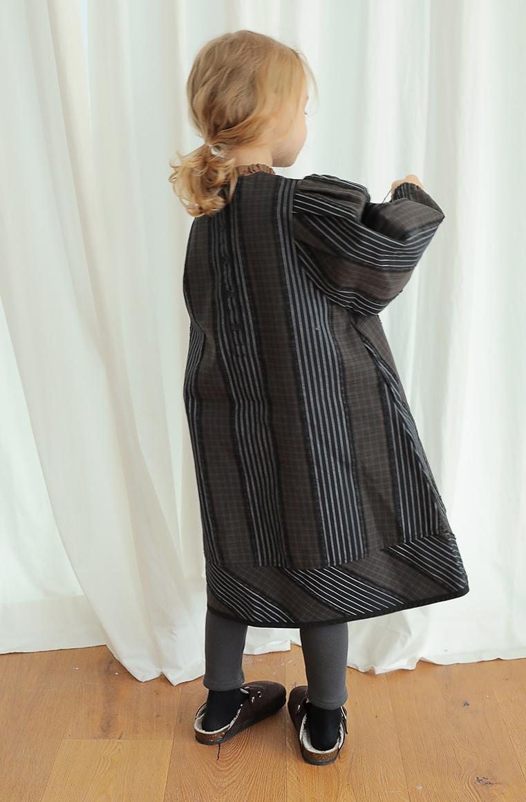 Aラインに広がるシルエットに、ネックラインの配色フリルや袖のギャザーディテールを添えて、ロマンティックな雰囲気をプラス。