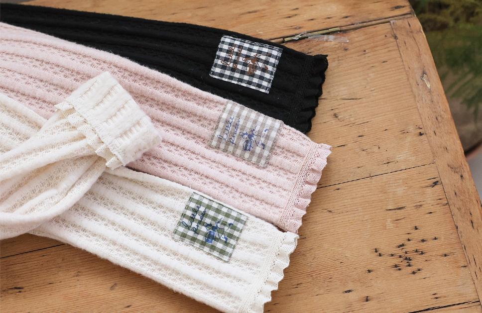 小さなパッチデザインがポイントになり、裾にはレースをあしらってガーリーな印象に。