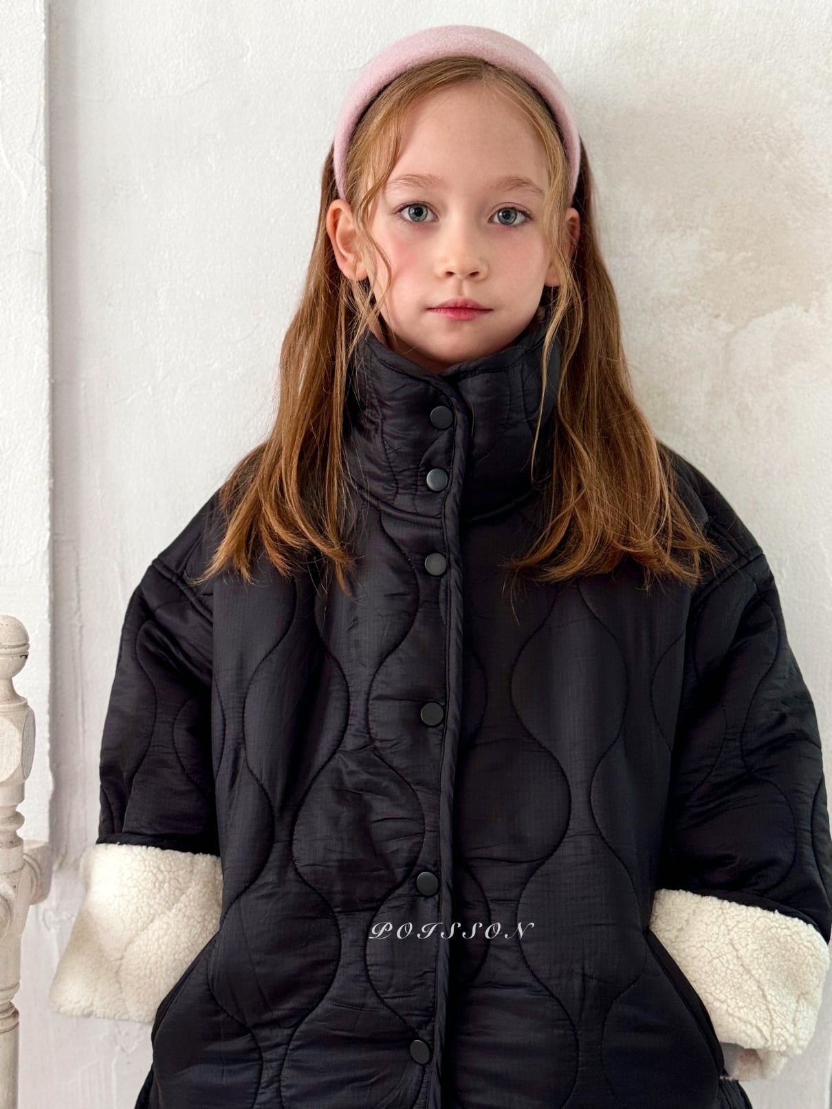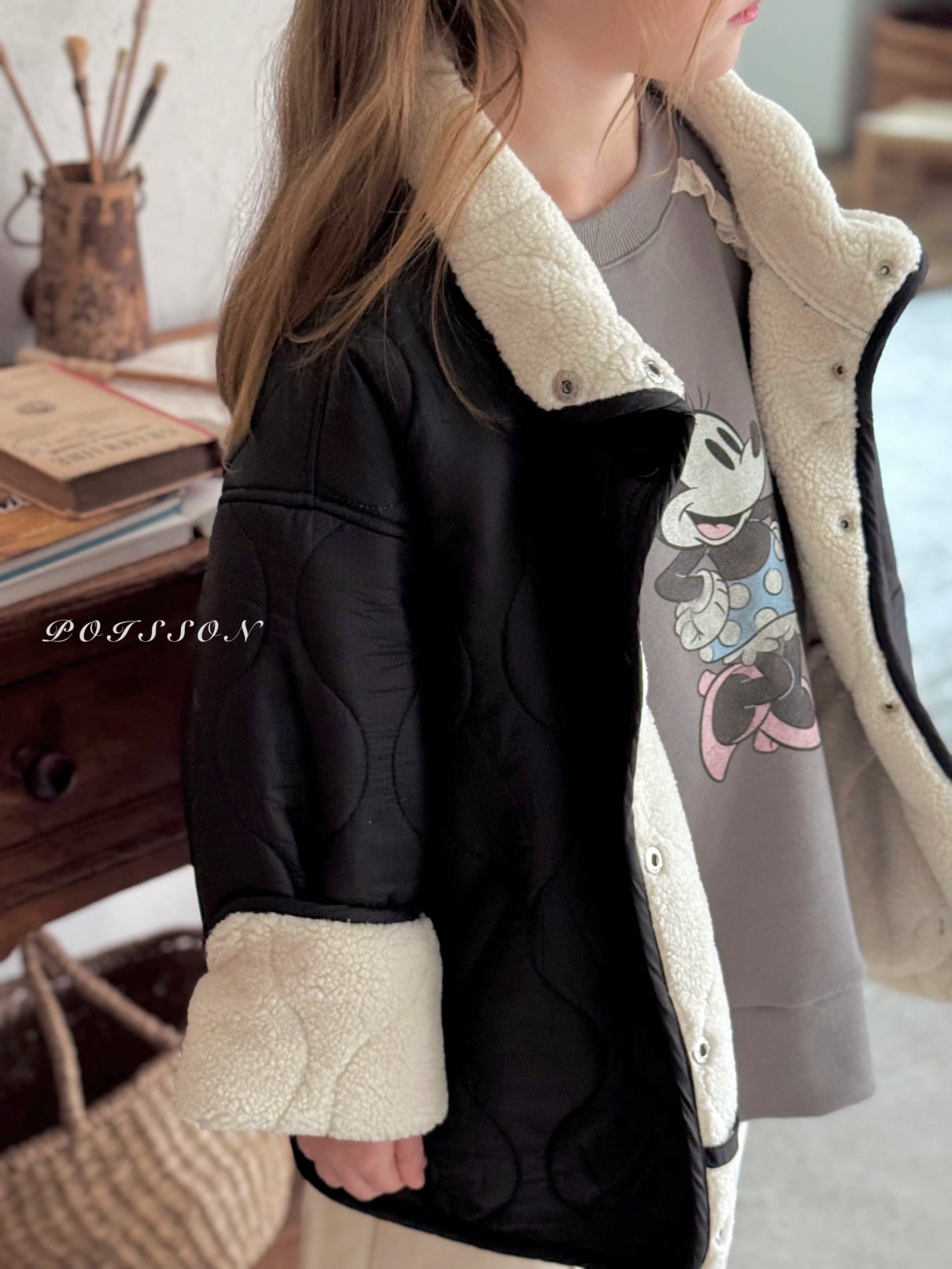 袖のボア素材がポイントで軽くて暖かく気軽に着れて、可愛いシルエットに仕上げています。