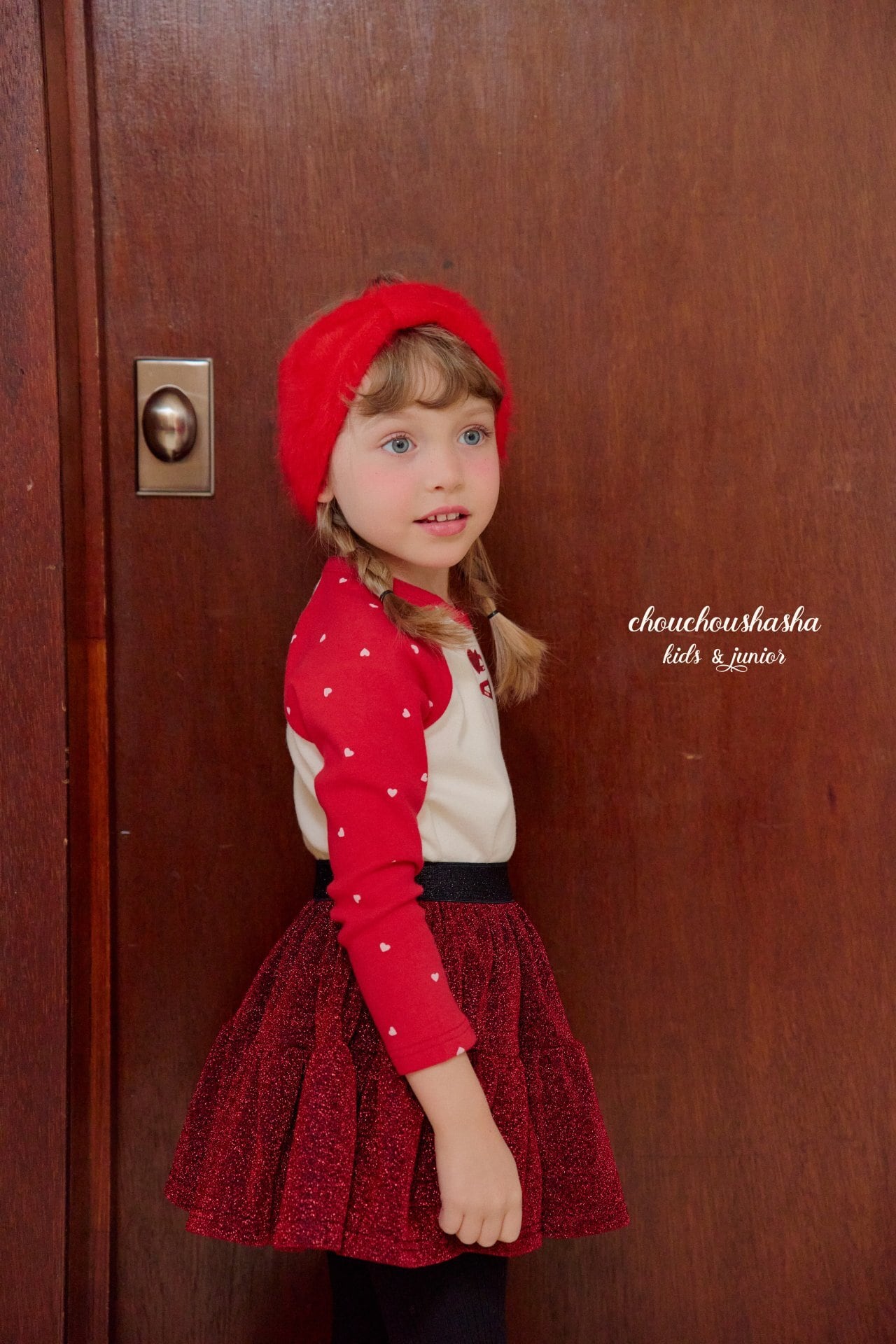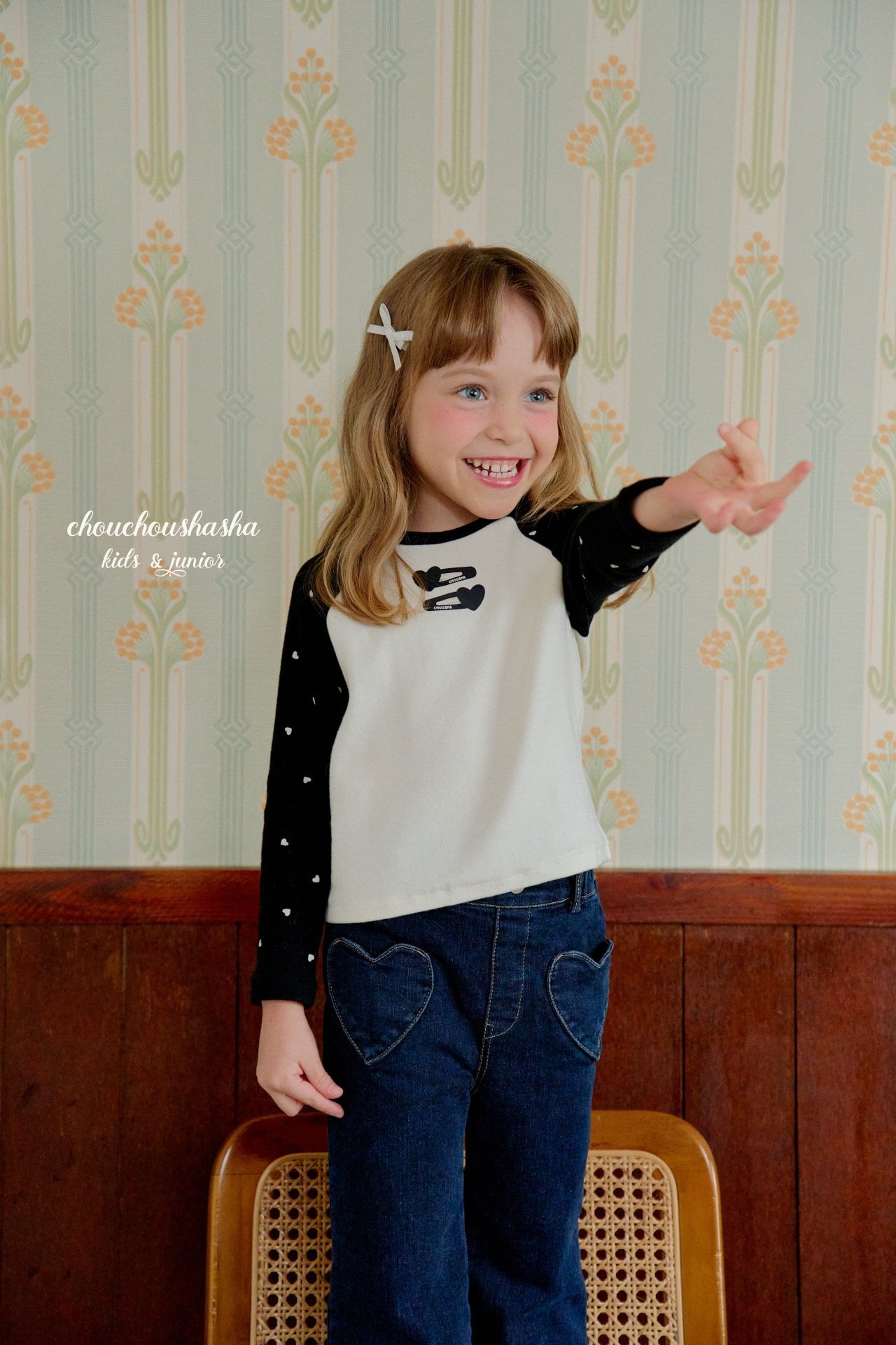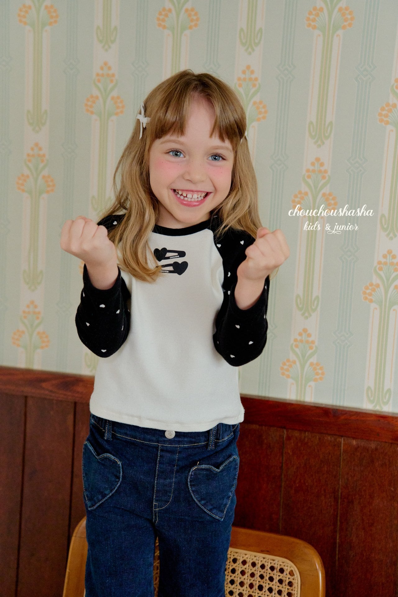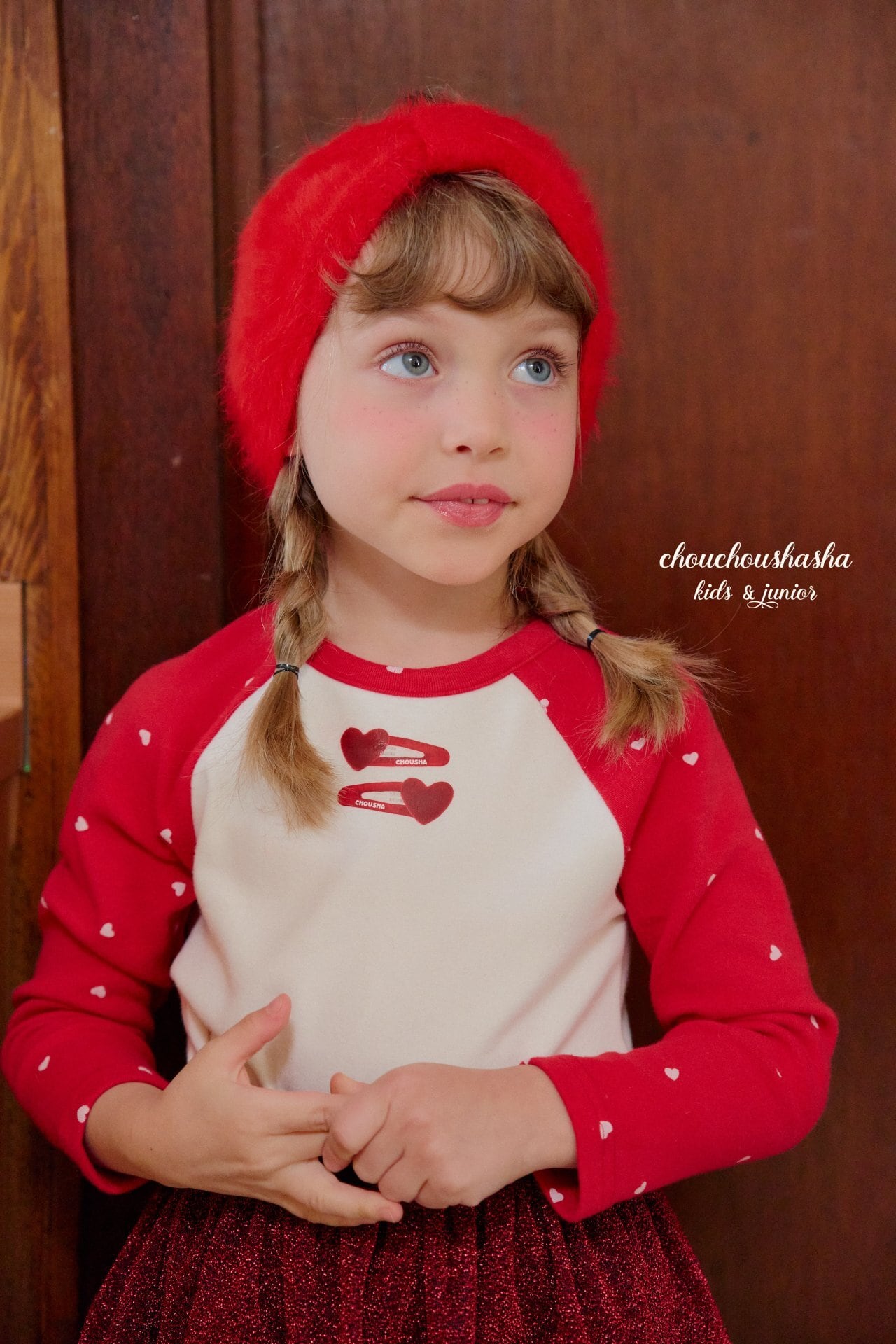 袖口とネックラインにはハートプリントをあしらい胸元にはハートのヘアピンを二つ並べた可愛らしいアクセントを添えました。