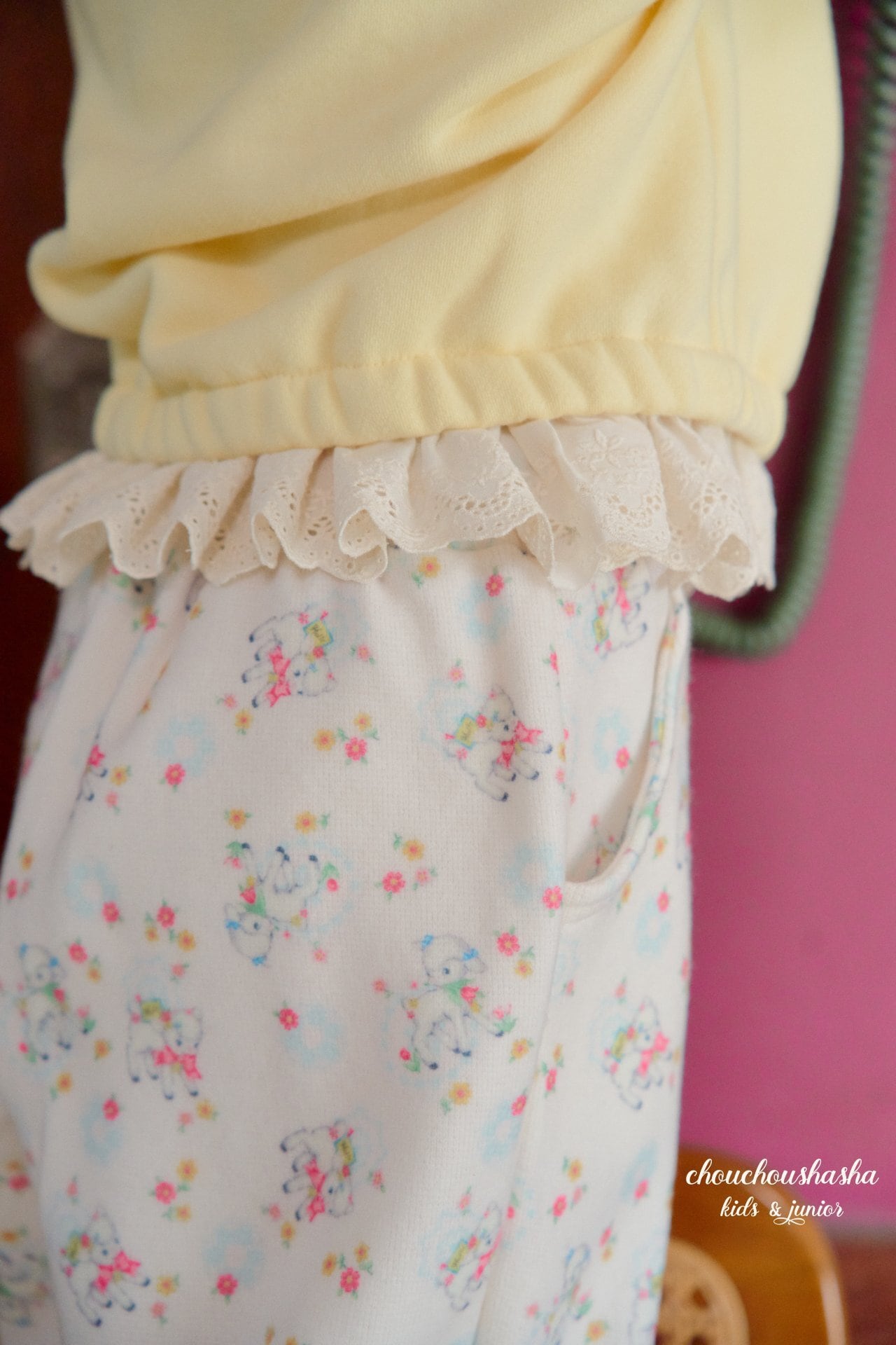 花畑で遊ぶ子羊のモチーフが全体にプリントされており、とても愛らしいデザインに仕上がっています。