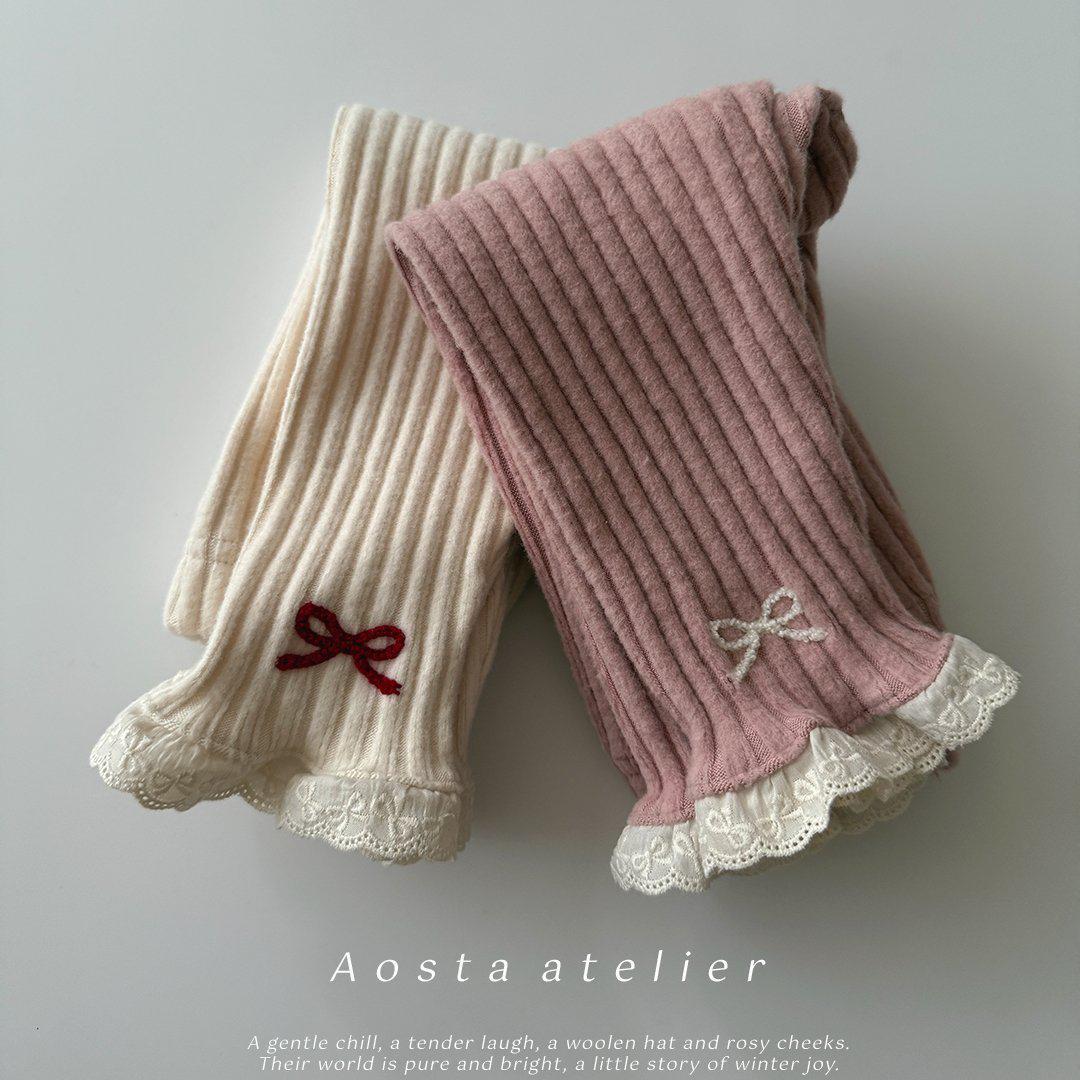 冬らしいカラーにリボンの飾りと程よく体にフィットするサイジングが絶妙に可愛いレギンスです。