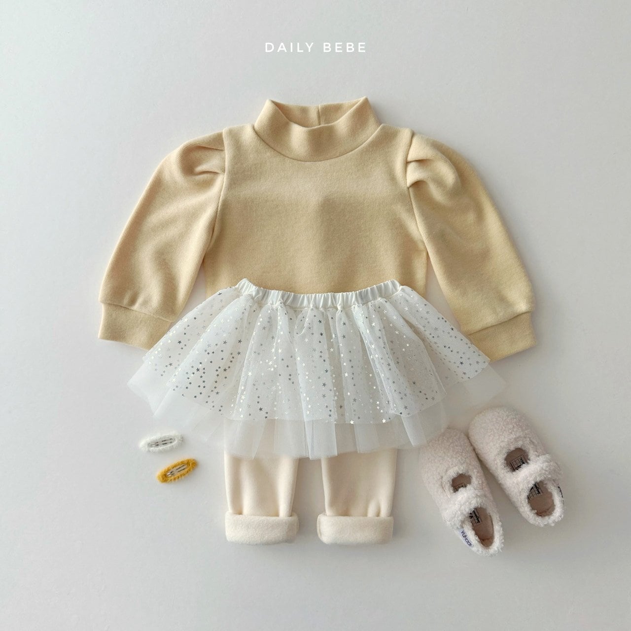 ハーフネックデザインとふんわりとした肩のシャーリングが、着用時に愛らしさを引き立てます。