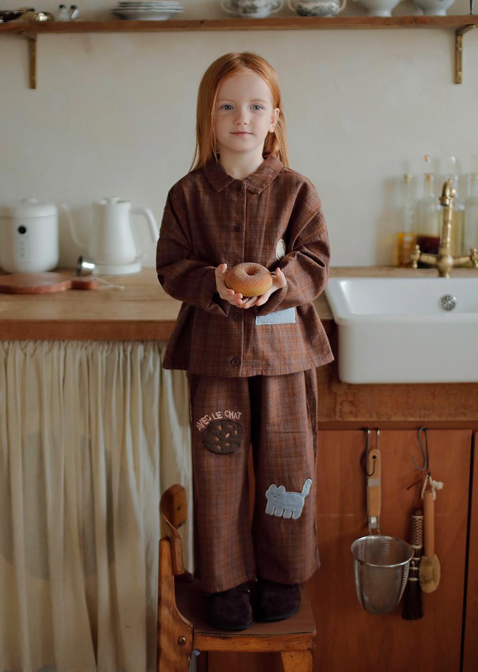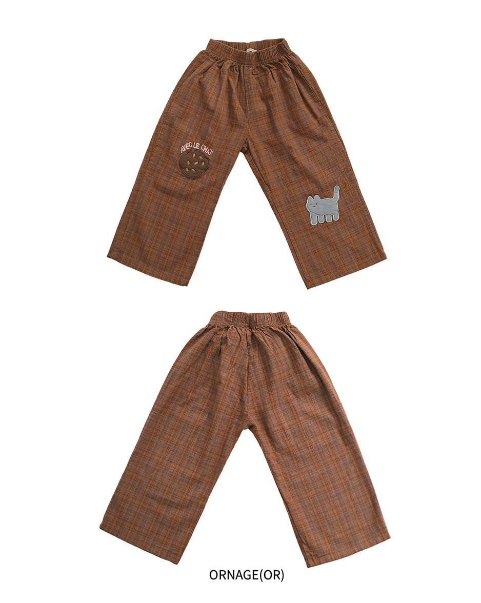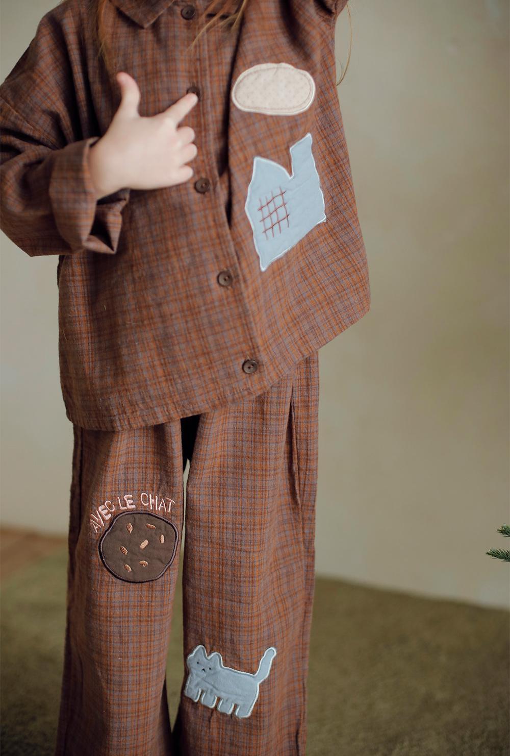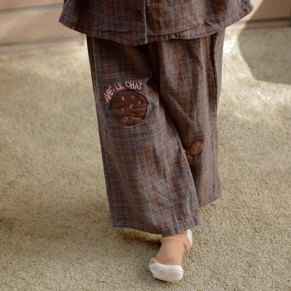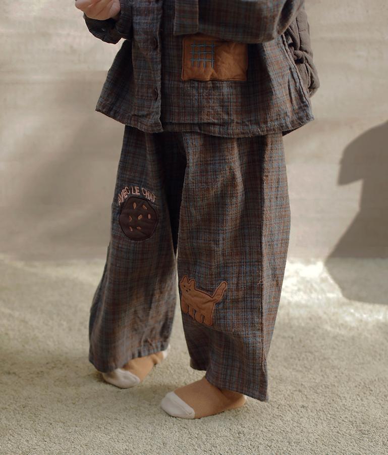 可愛いネコのパッチとクッキーパッチの刺繍が甘いアクセントになるパンツです。