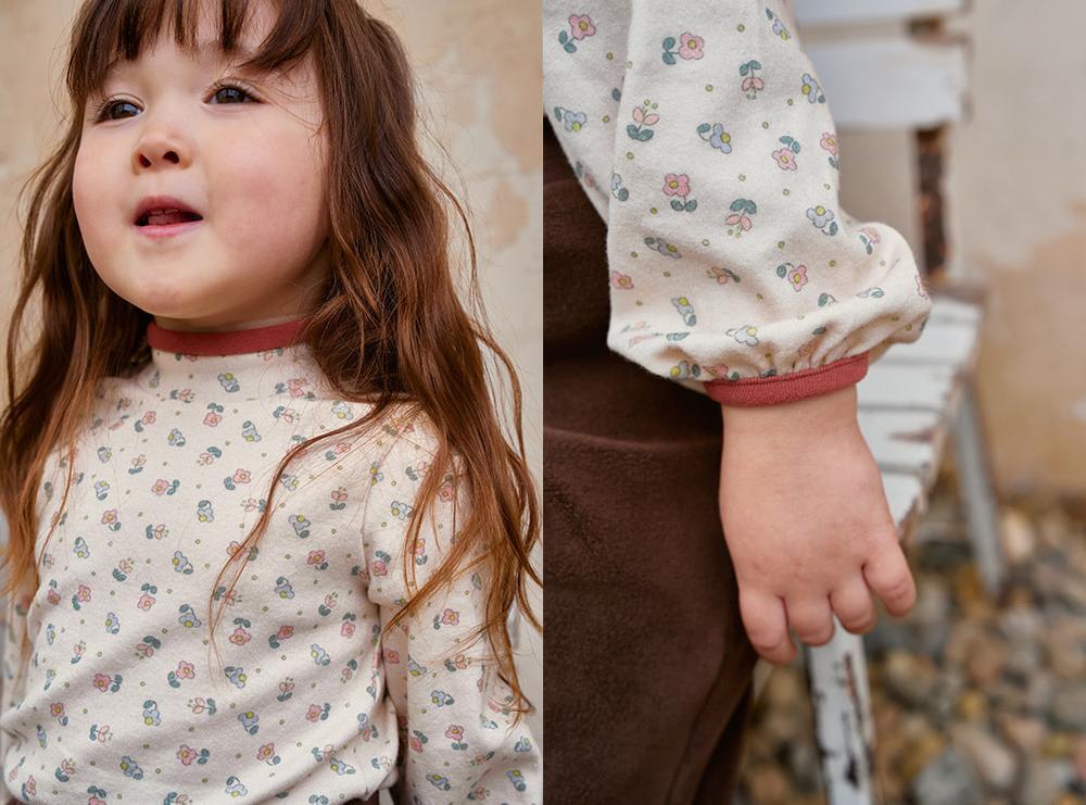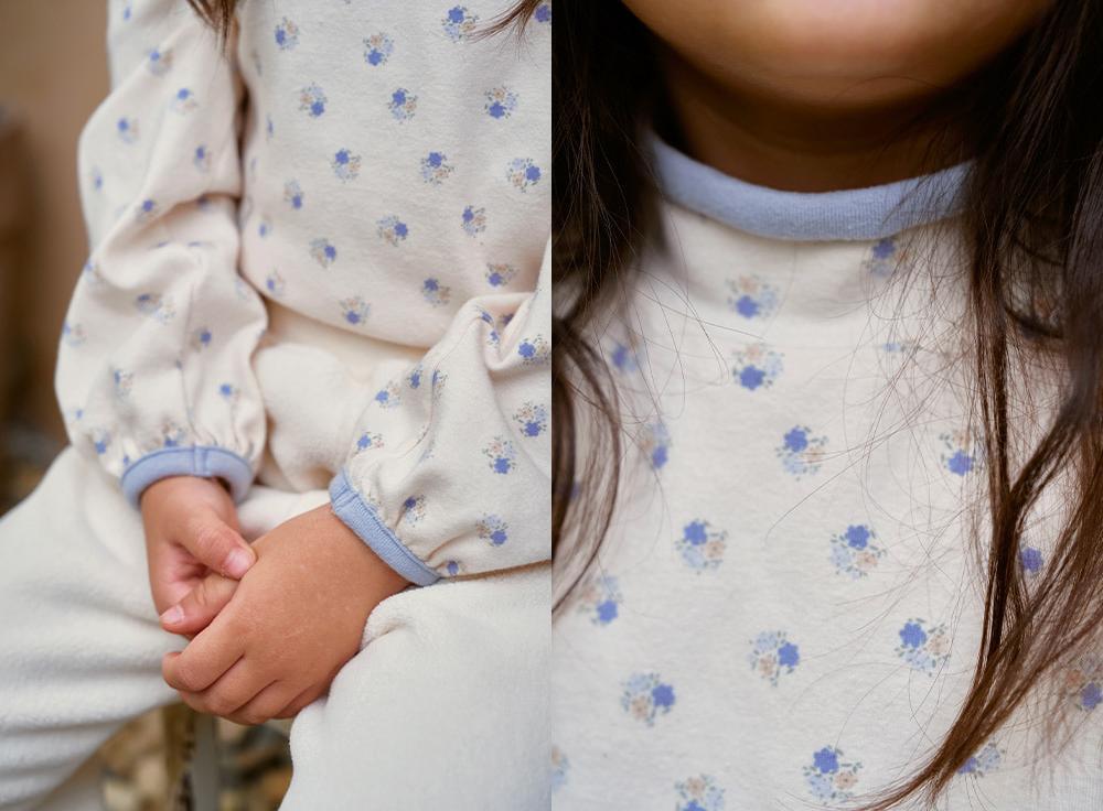 ネックラインと袖口は相性のよい配色生地でバインディングし可愛らしく仕上げました。