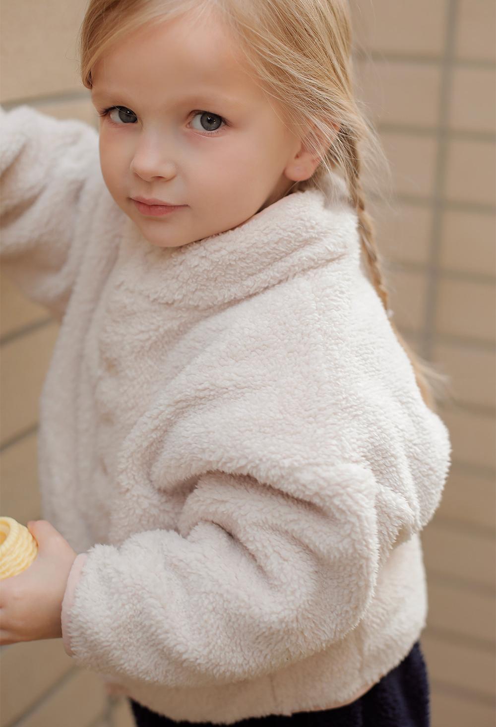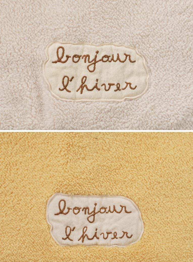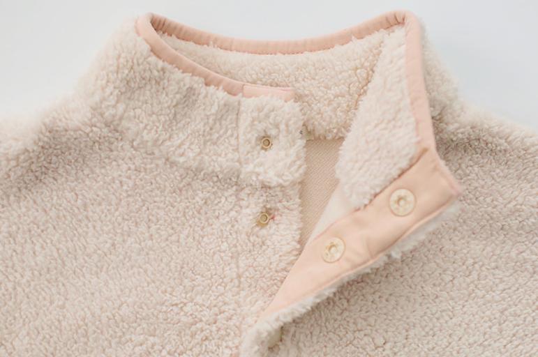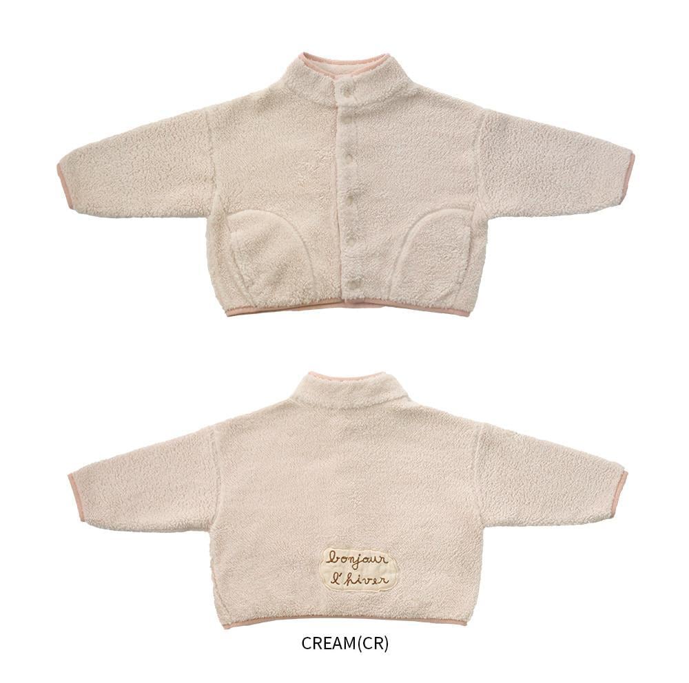 かろやかでやわらかなボア素材と内側のやさしいコットン素材を組み合わせ冬の装いにあたたかさをそえる一着です。
