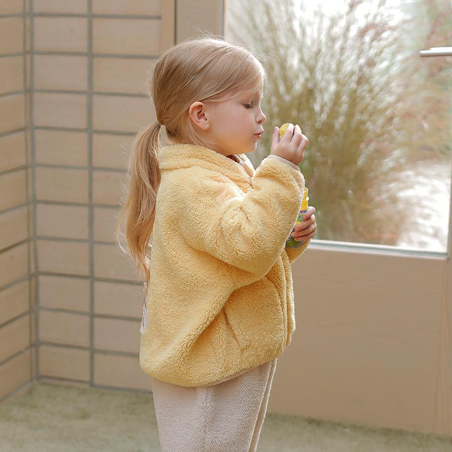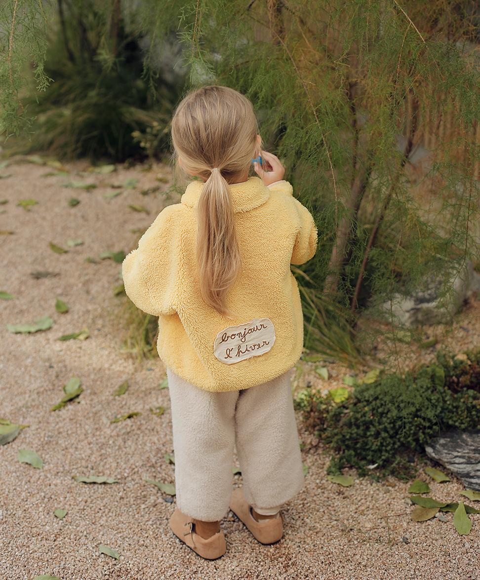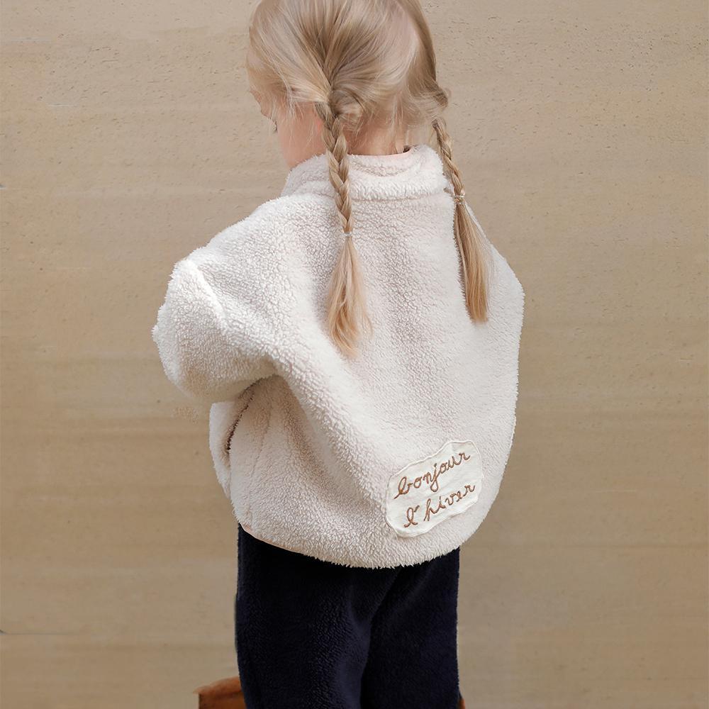 かろやかでやわらかなボア素材と内側のやさしいコットン素材を組み合わせ冬の装いにあたたかさをそえる一着です。