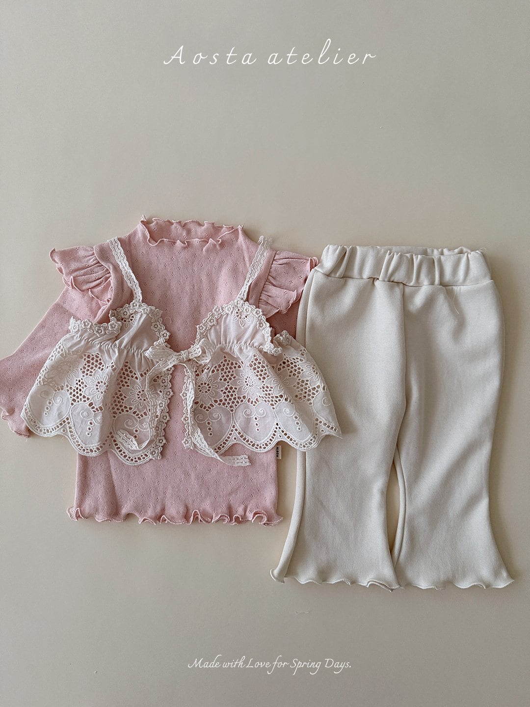 程よいフレアシルエットに裾にフリル、少し高めにウエスト位置を設定に裾のフリルがガーリーな印象のパンツです。