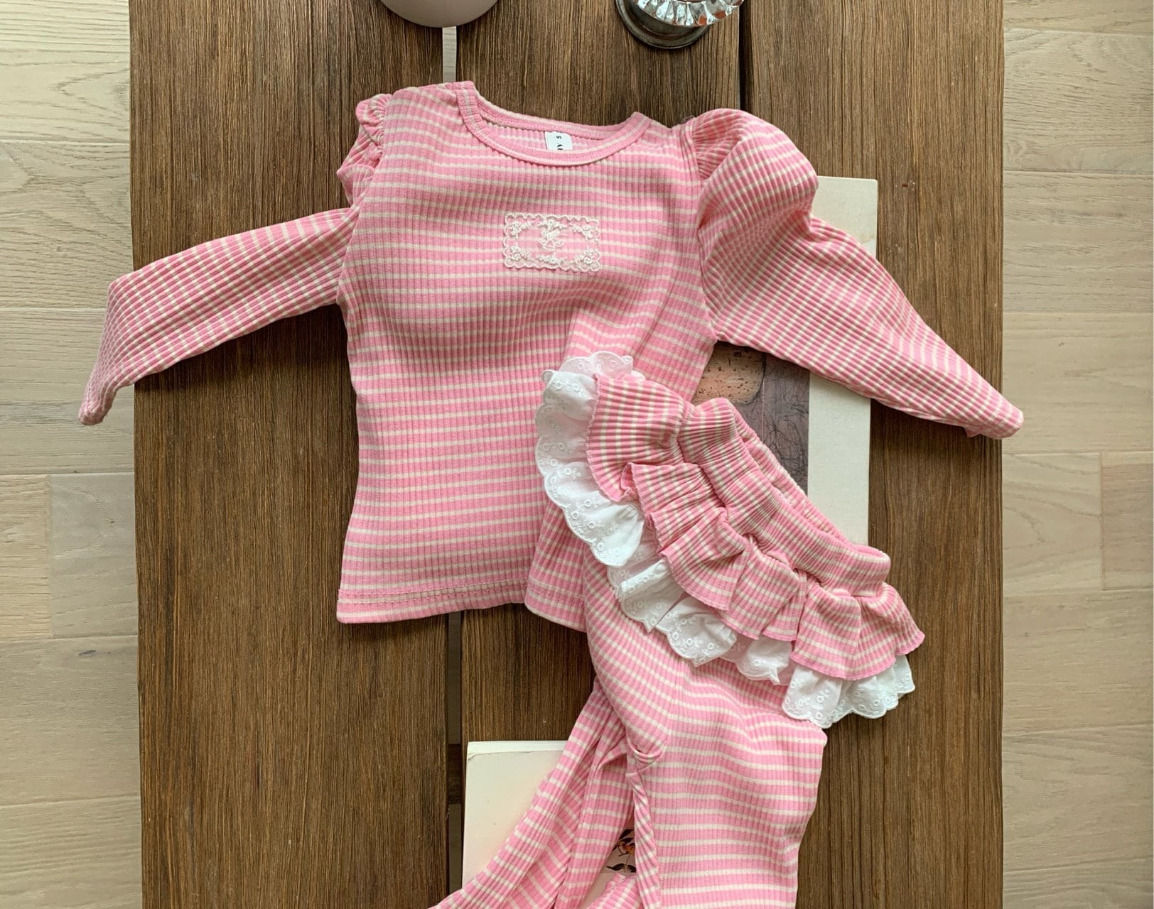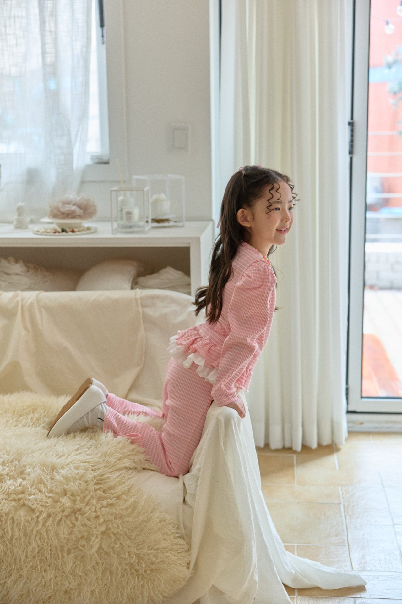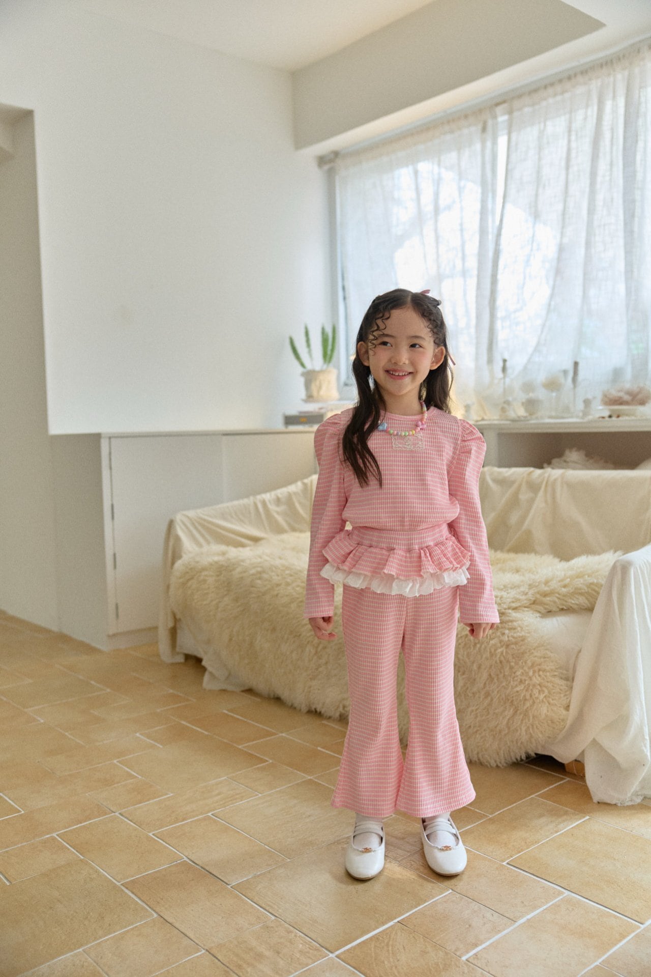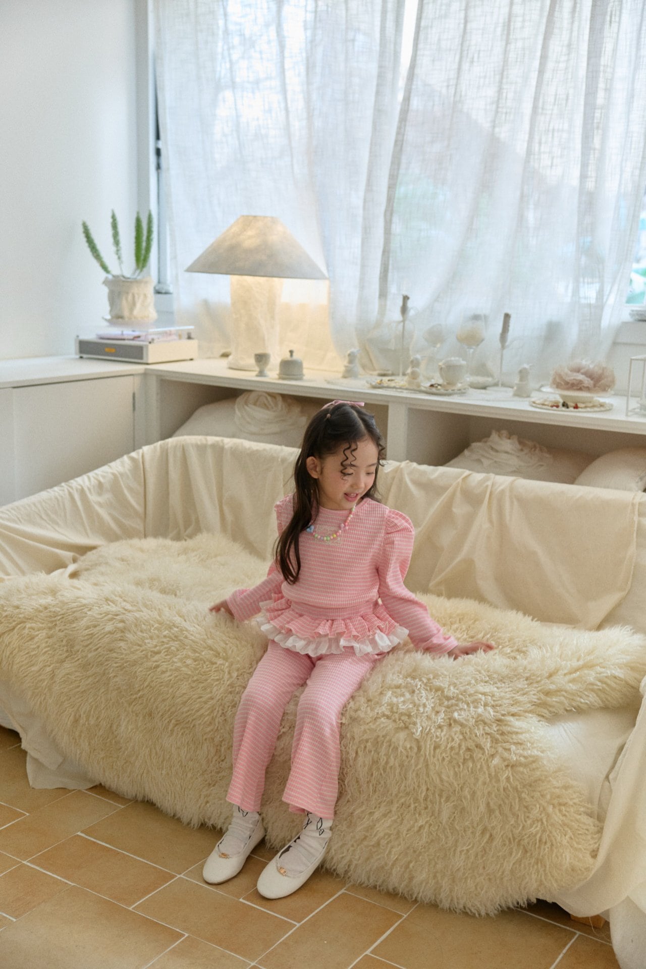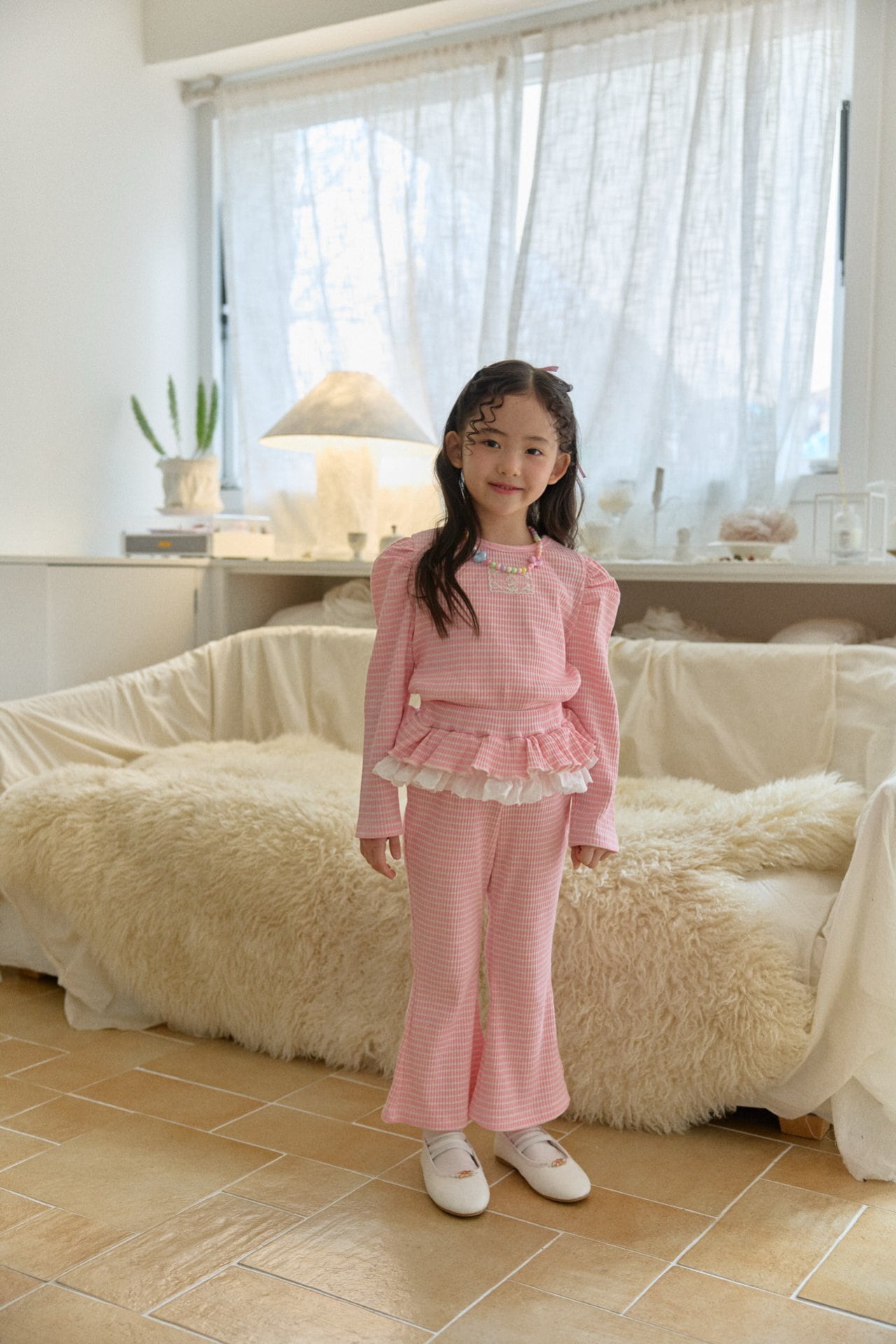 トップスは裾にレースフリルをあしらい動くたびにやさしく揺れる愛らしいデザインに仕上げました。