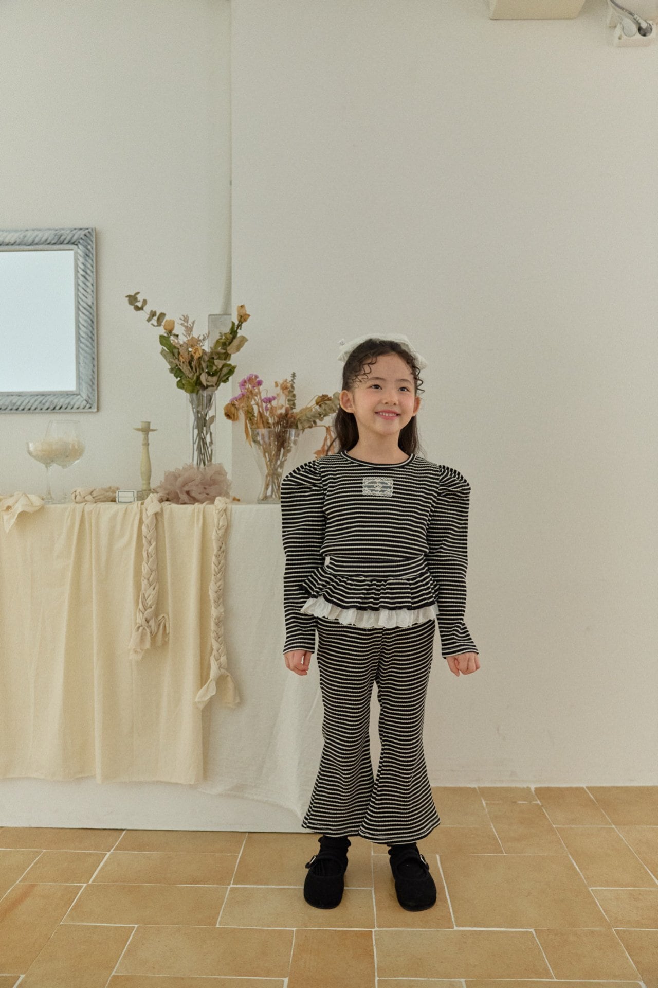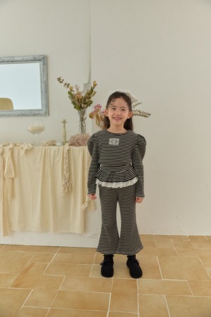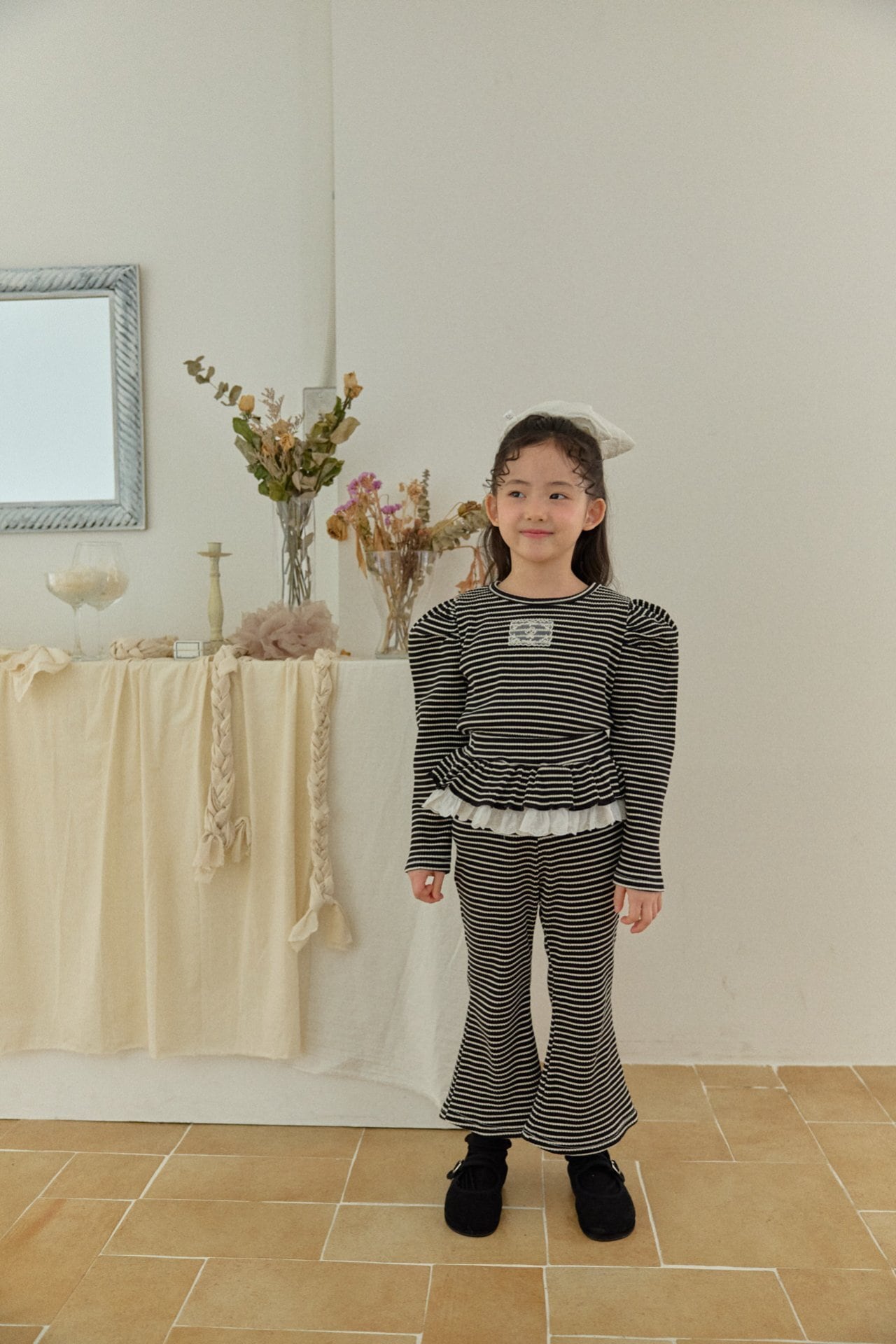 パンツは広がりのきれいなフレアシルエットで軽やかさと上品さを兼ね備えています。