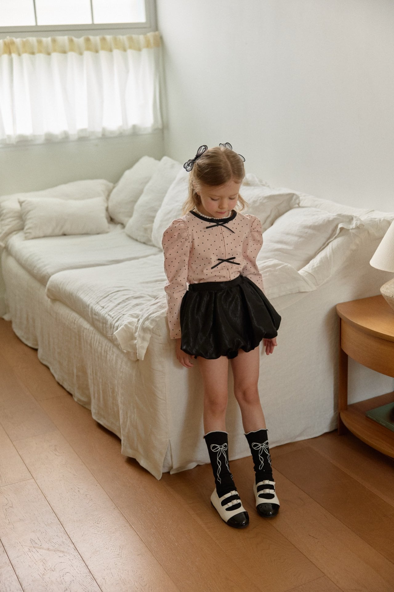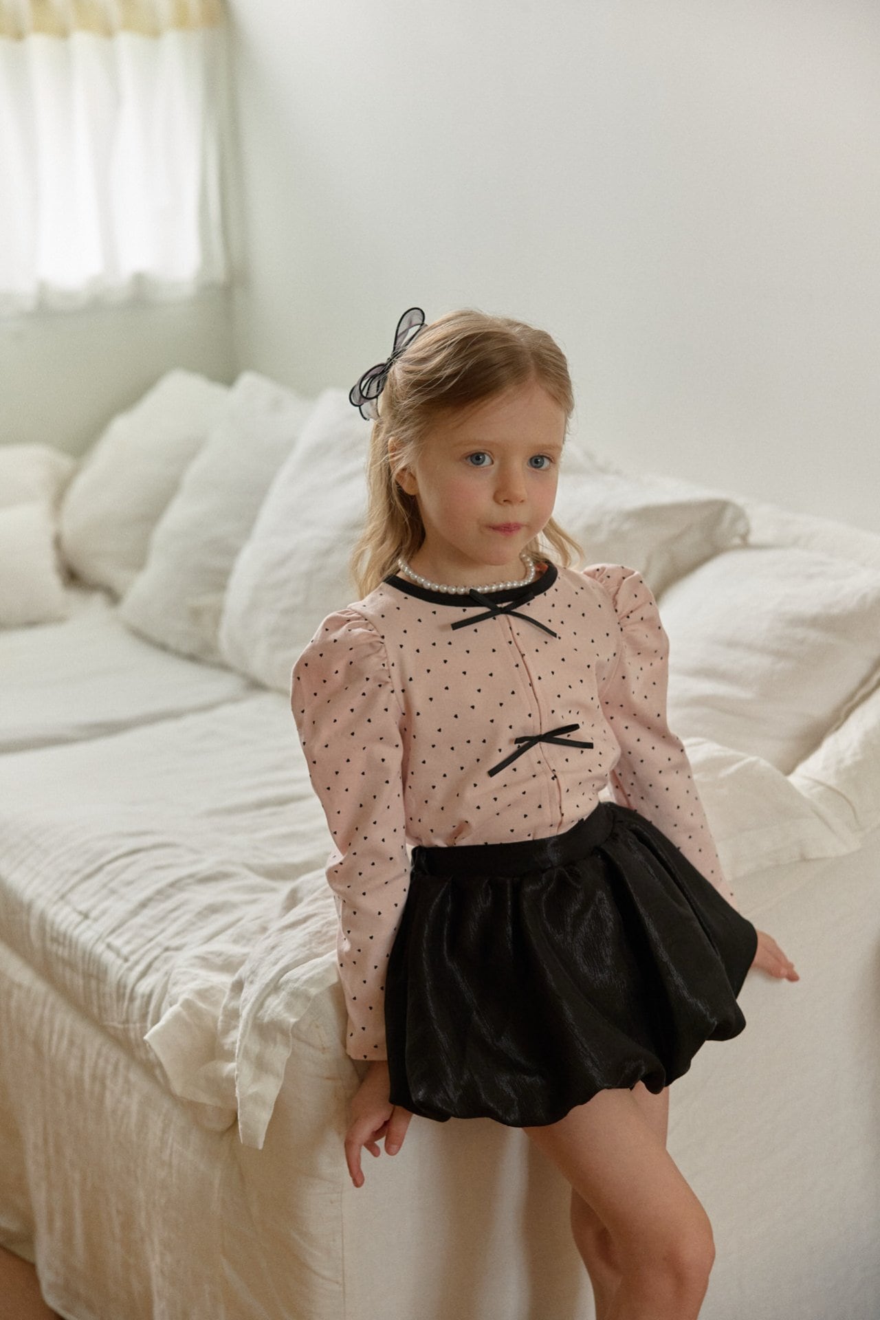 袖はふんわりとしたパフスリーブ仕様でやさしく華やかな印象に。