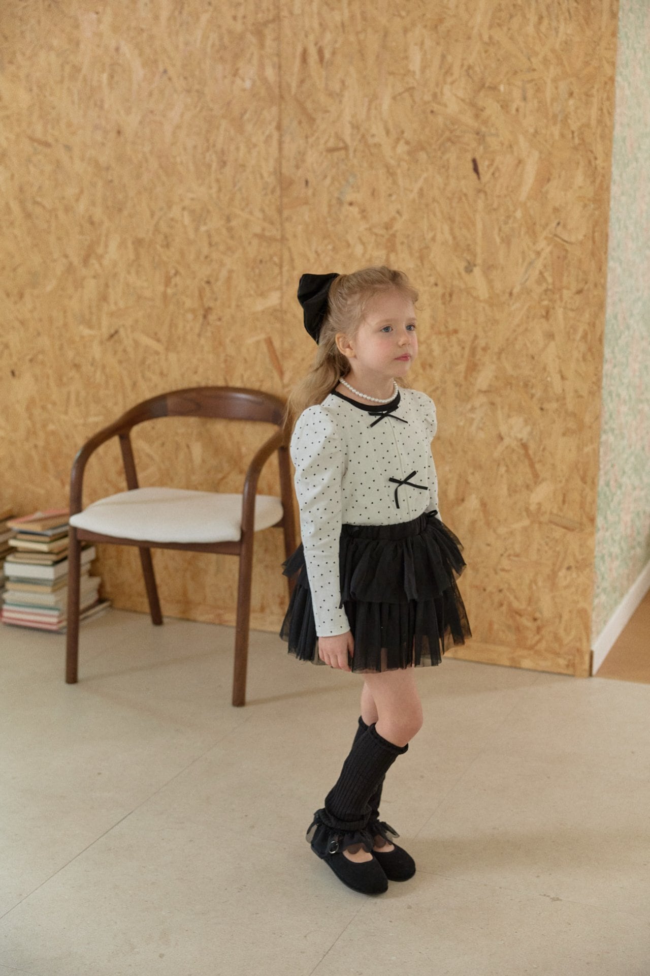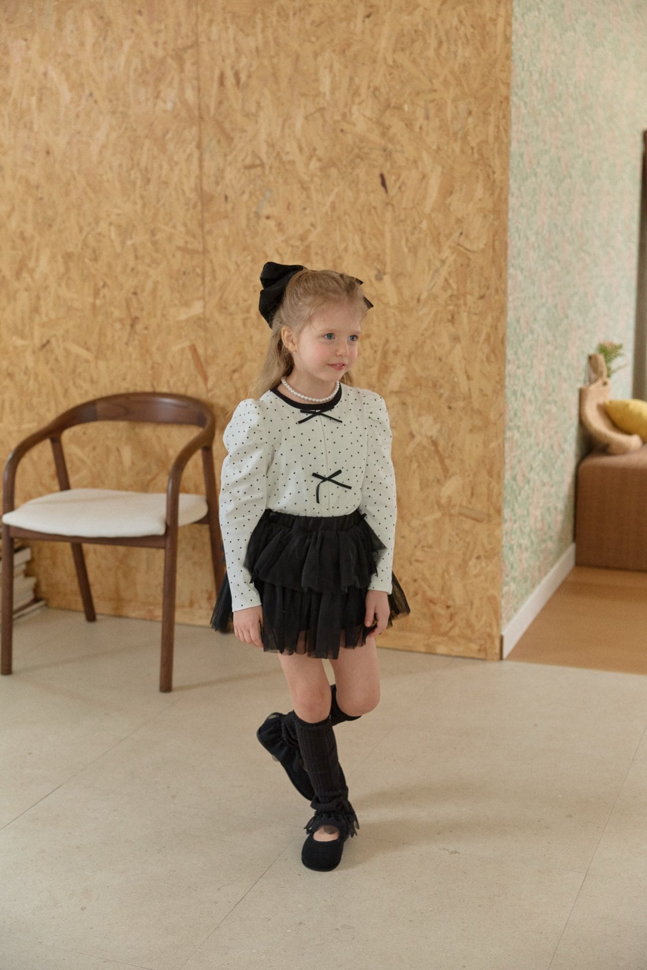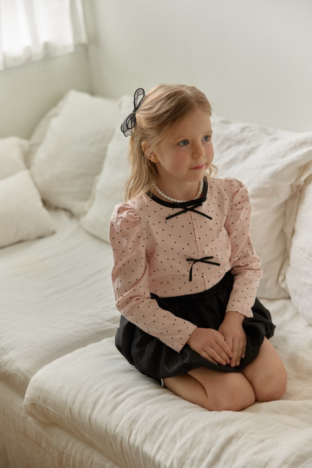 胸元にはリボンの飾りをあしらいガーリーなアクセントをプラスしました。