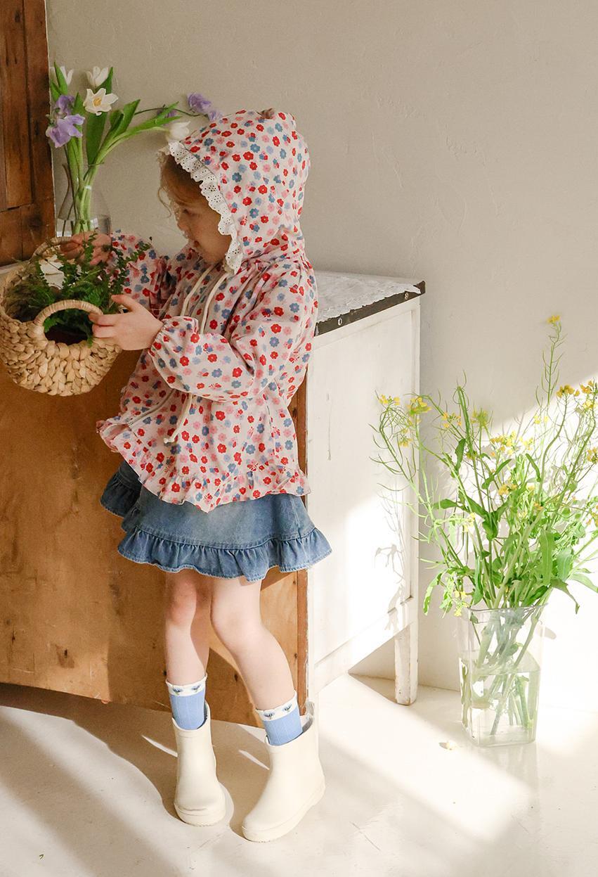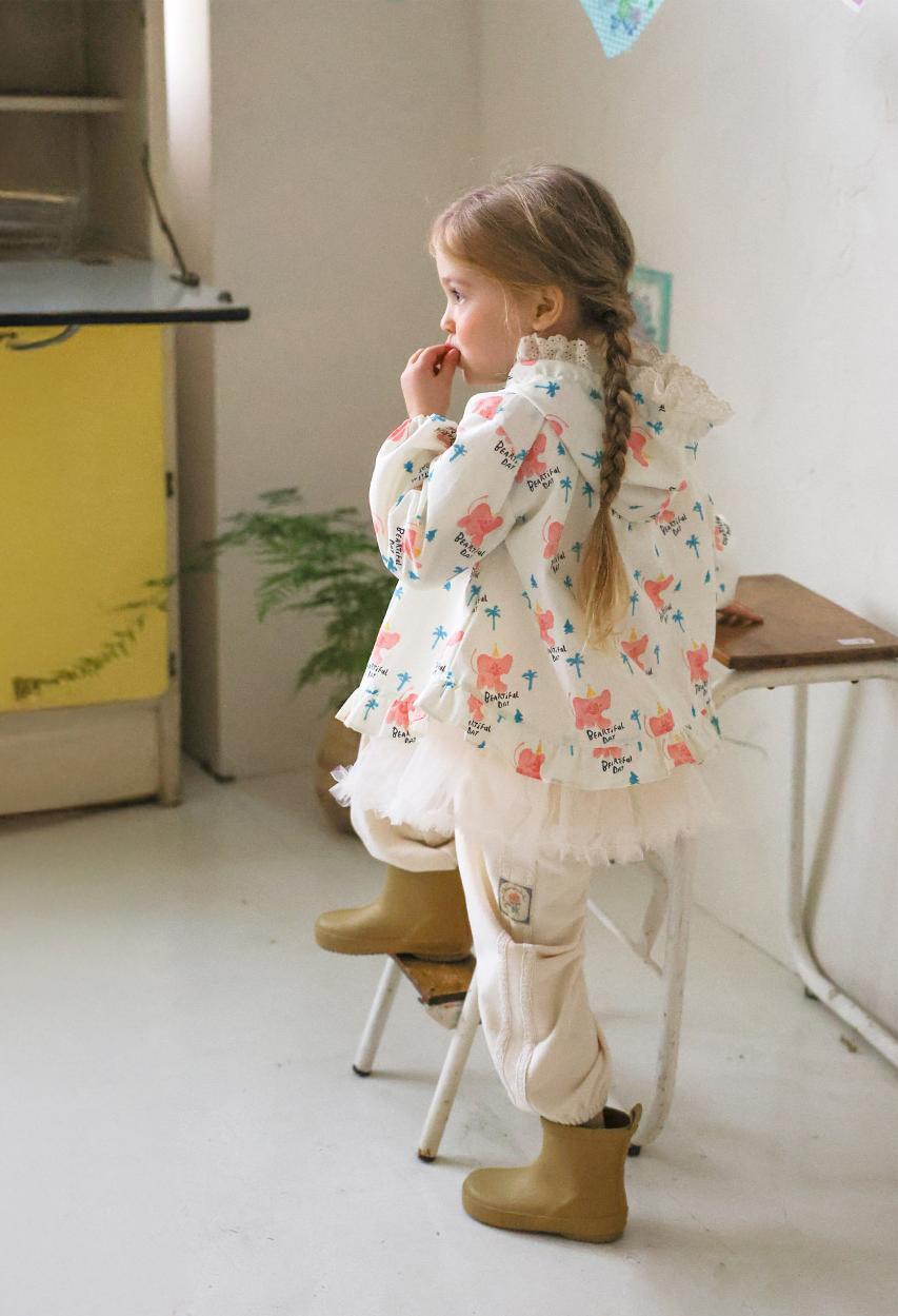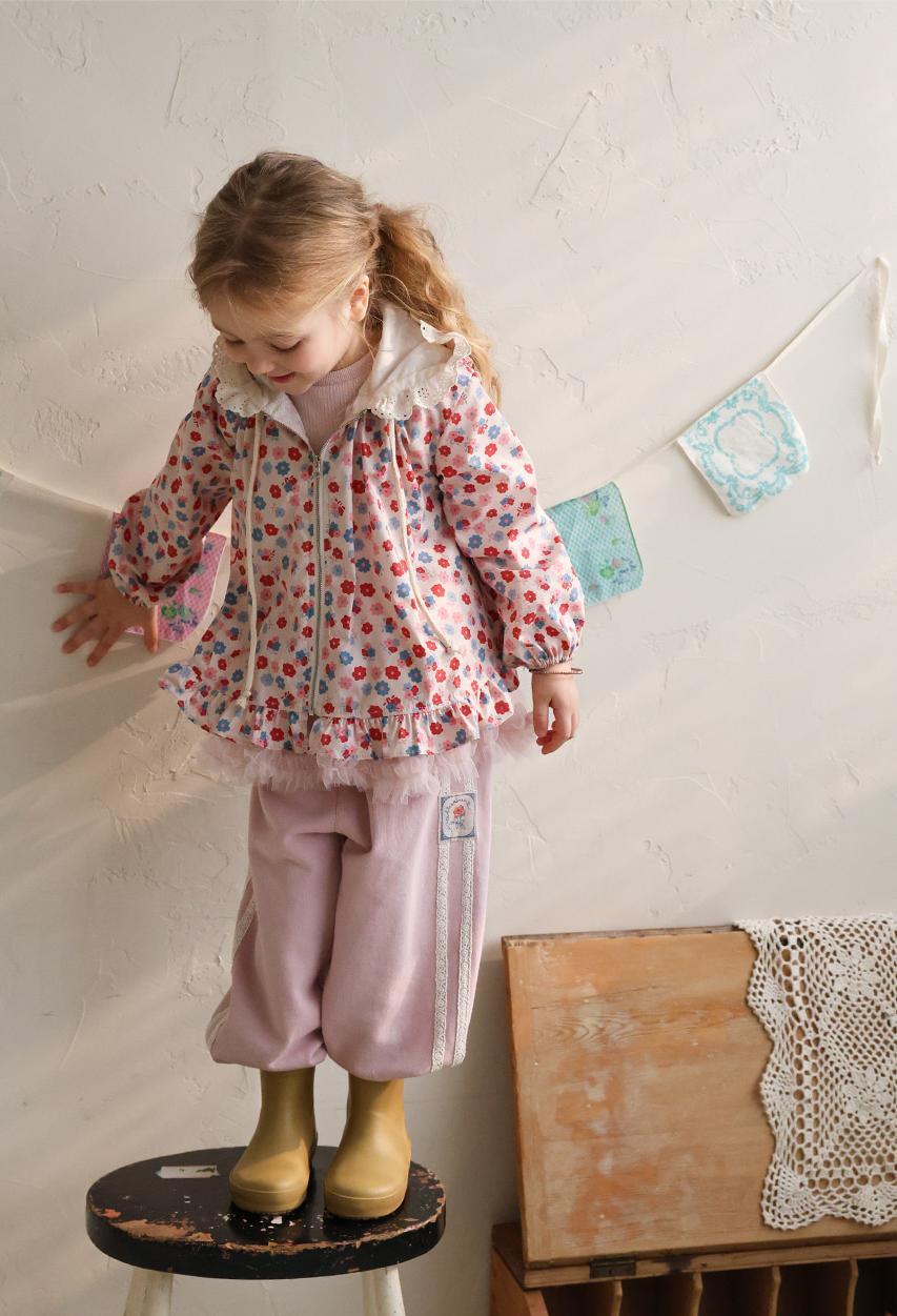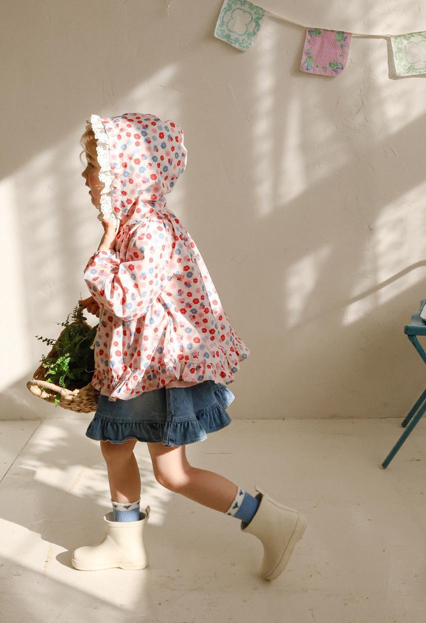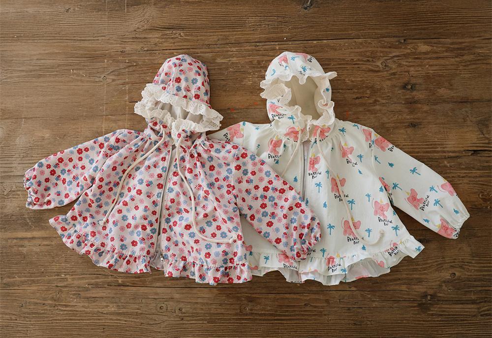 華やかな花柄に加えフード部分のレースデザインが上品なアクセントになり女の子らしい雰囲気を演出します。