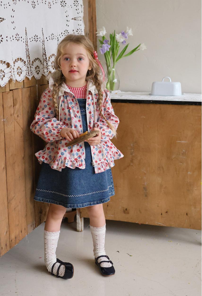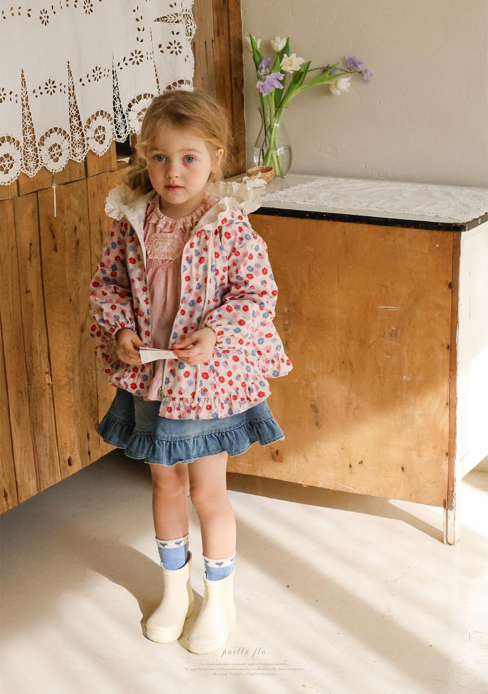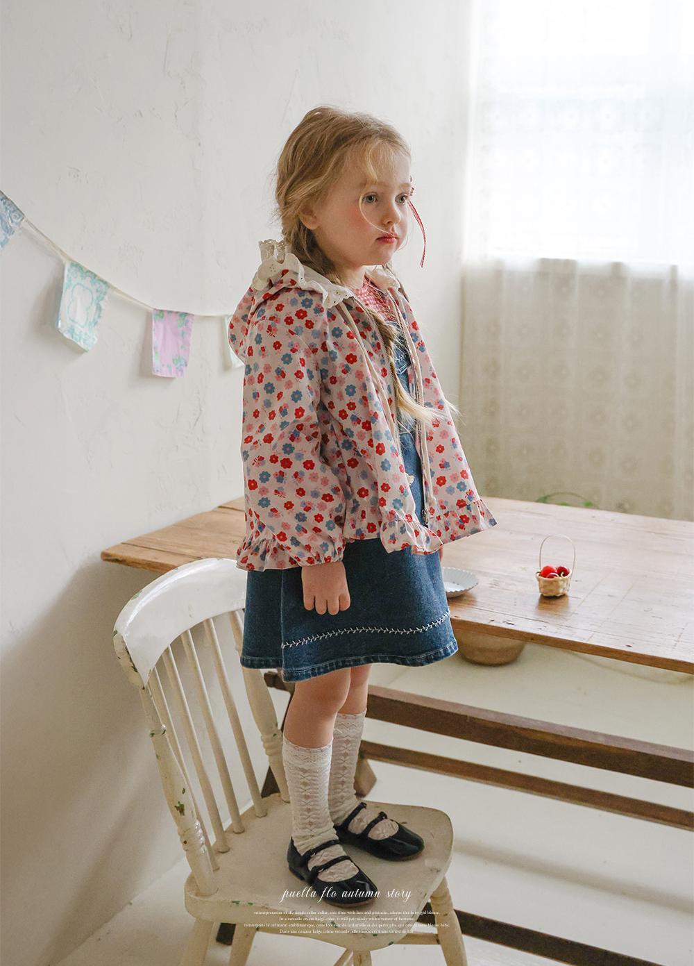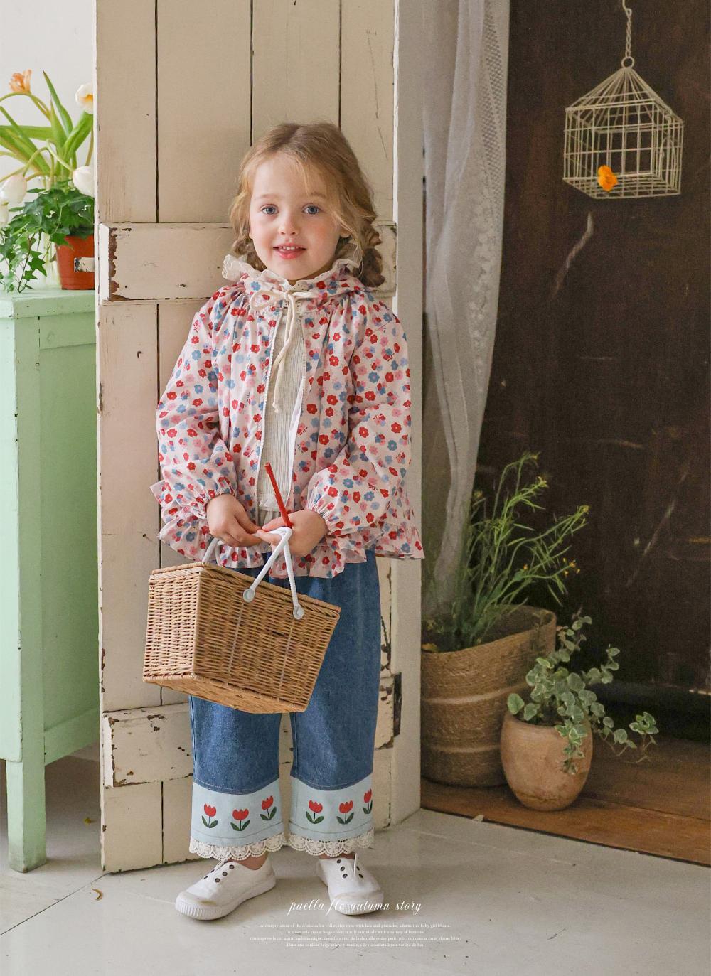 華やかな花柄に加えフード部分のレースデザインが上品なアクセントになり女の子らしい雰囲気を演出します。
