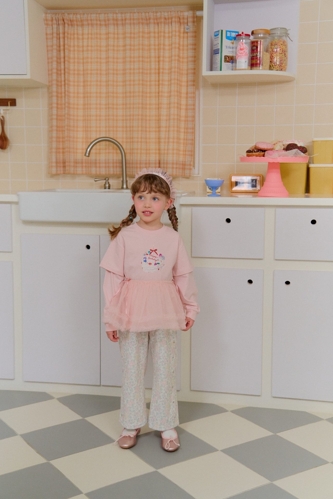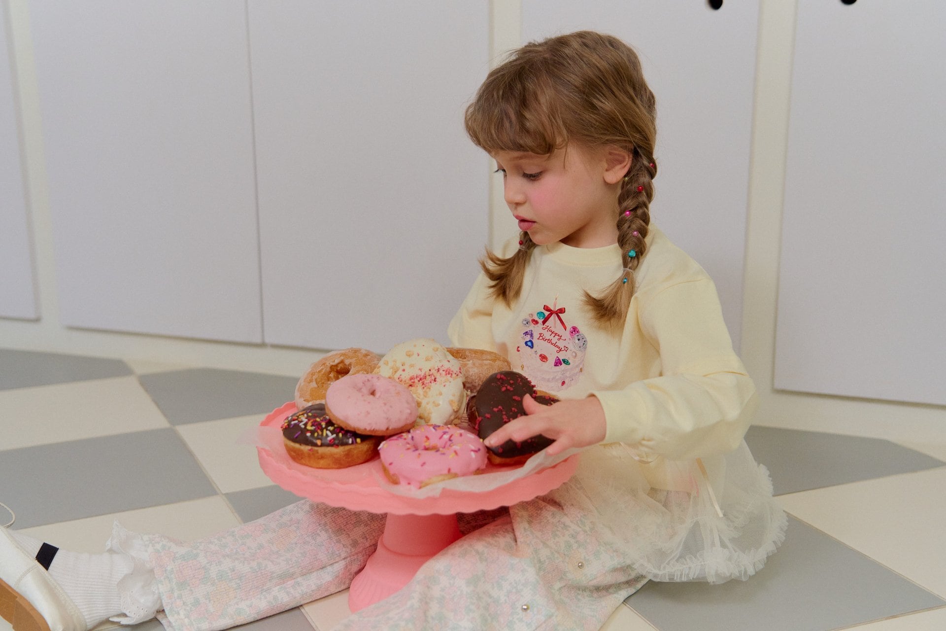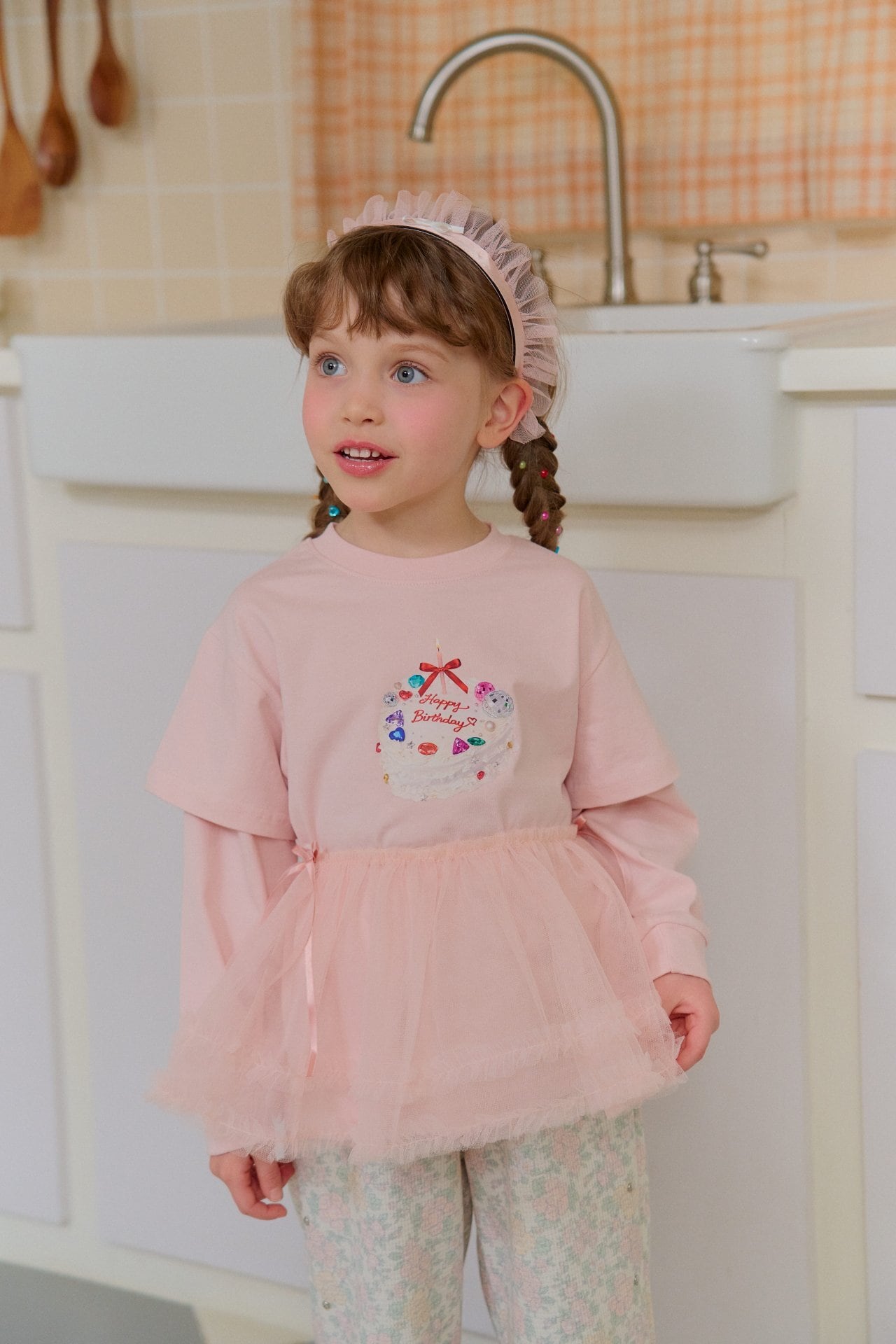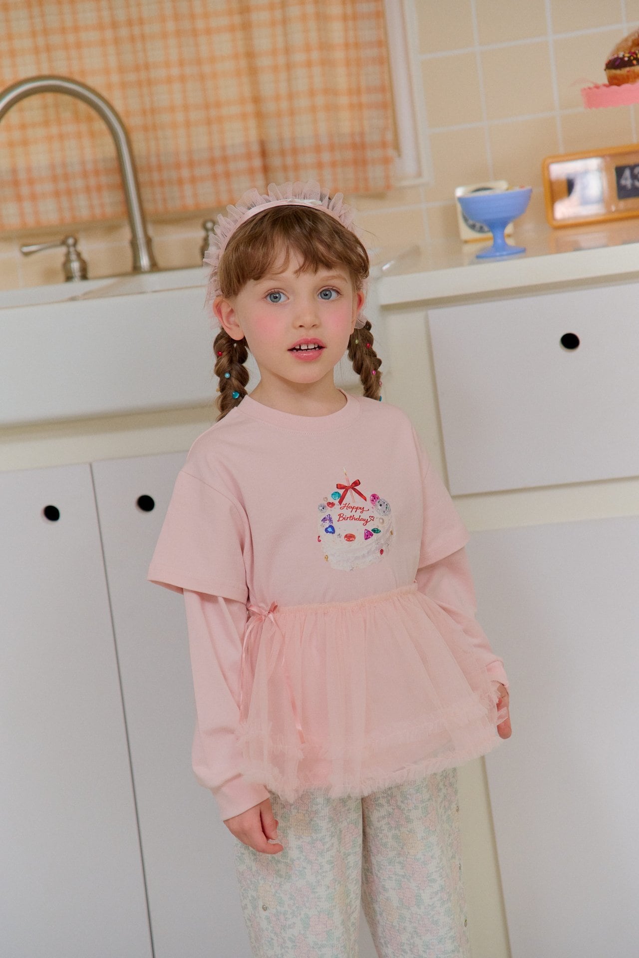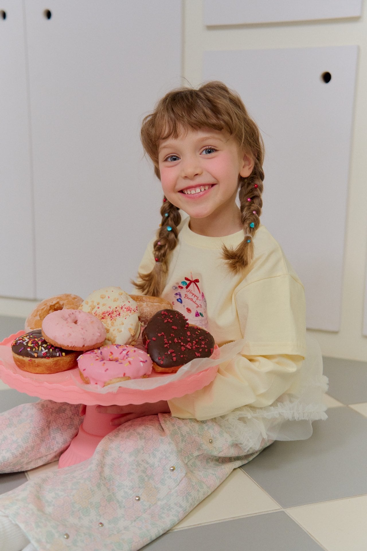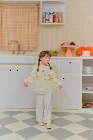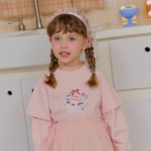 やさしい色合いのボディに、リボンや半立体のジュエリーモチーフ、キャンドル付きケーキプリントをあしらい、Shushu Shushaらしい愛らしくロマンティックなムードに仕上げたトップス。