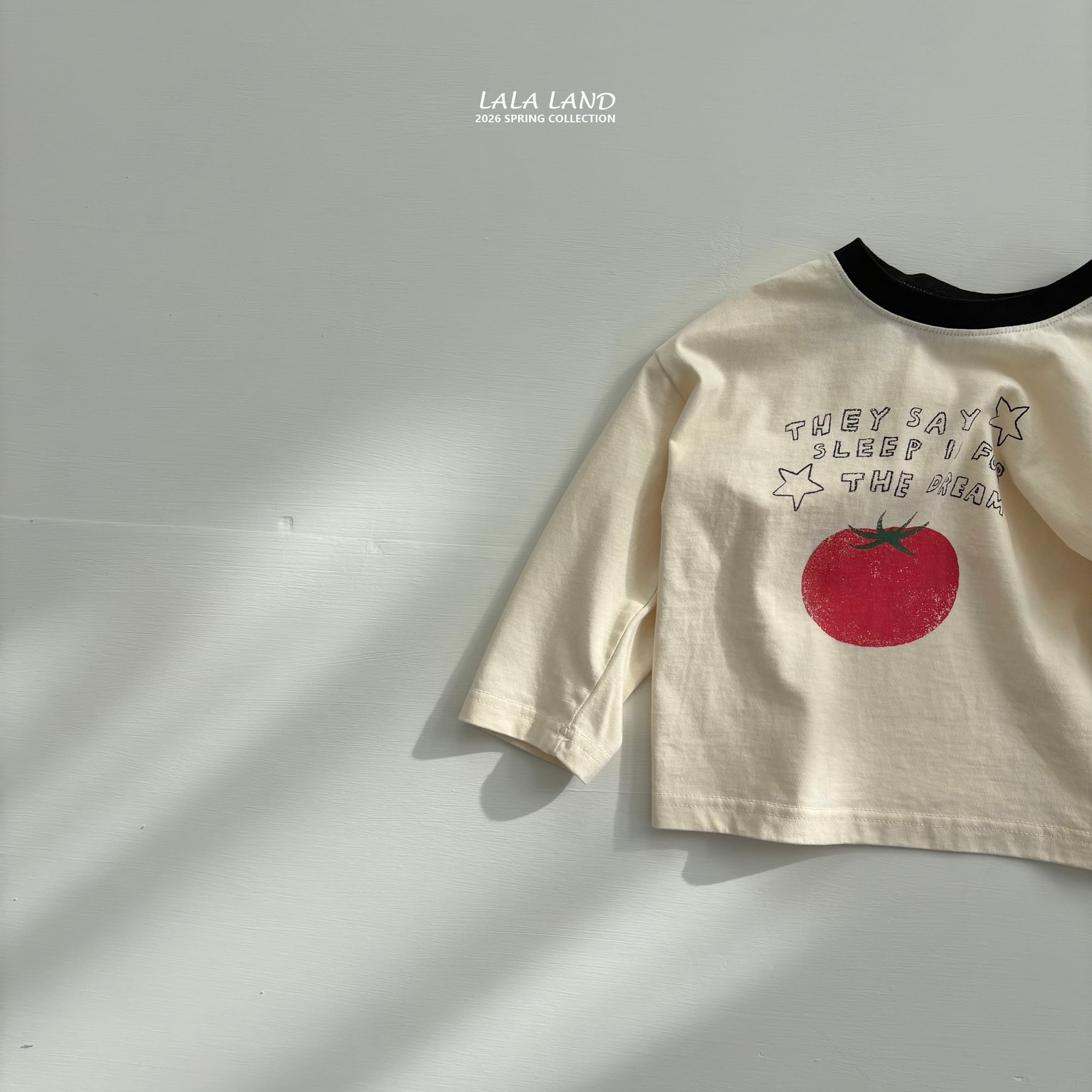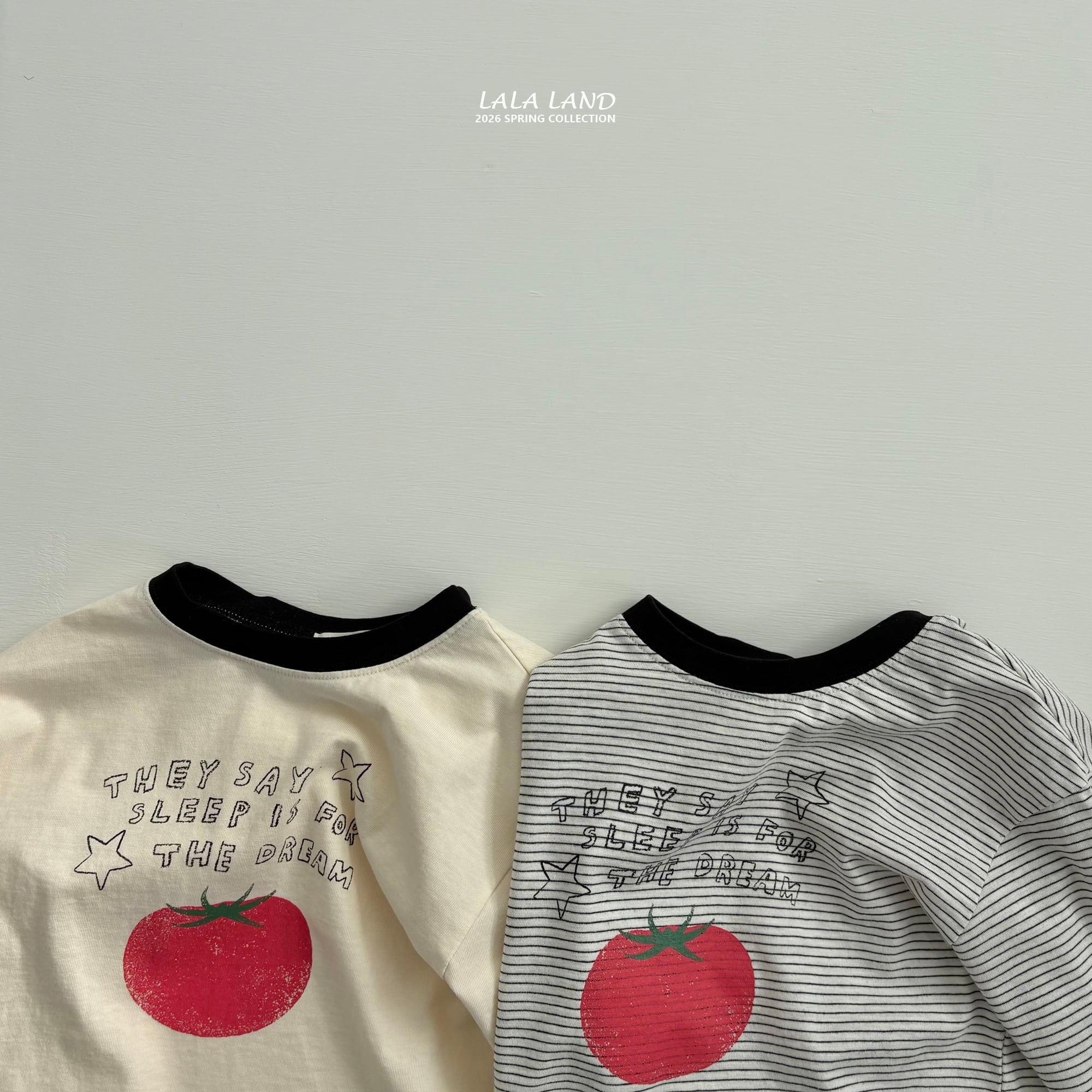 フロントにあしらったトマトのイラストが遊び心のあるアクセントとなり装いに明るく楽しい印象を添えます。ネックラインの配色デザインがさりげないポイントとなりシンプルながらもおしゃれ感を引き立てます。