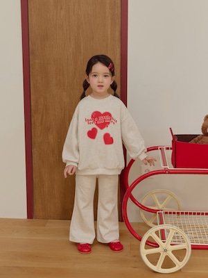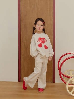 キュートなイラストをあしらったトップスとふんわり広がるフレアパンツの組み合わせが愛らしい印象を引き立てます。