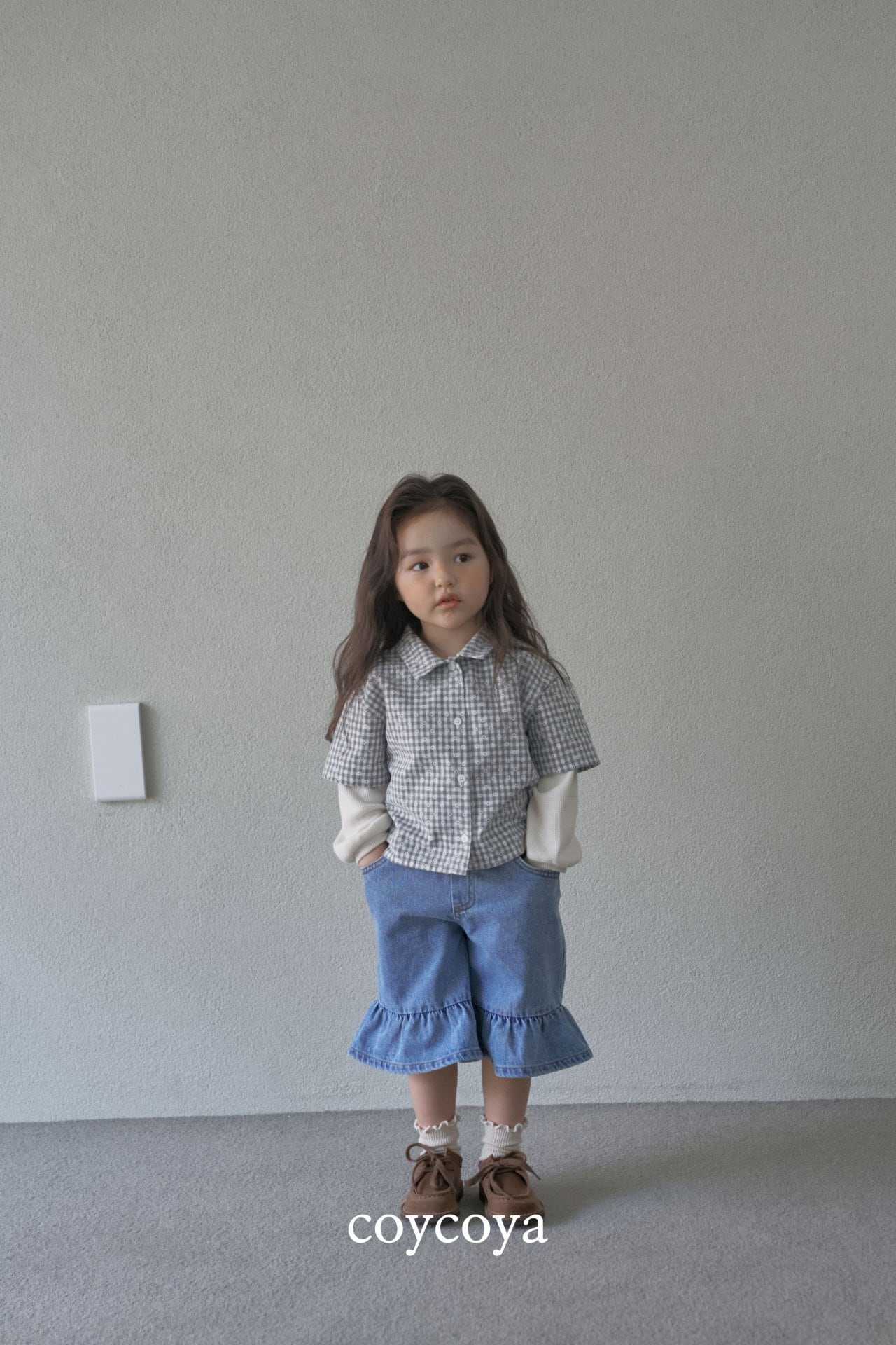 リネンとコットンをブレンドしたチェック柄生地に小さな花びらモチーフの立体プリントをあしらったトップスです。