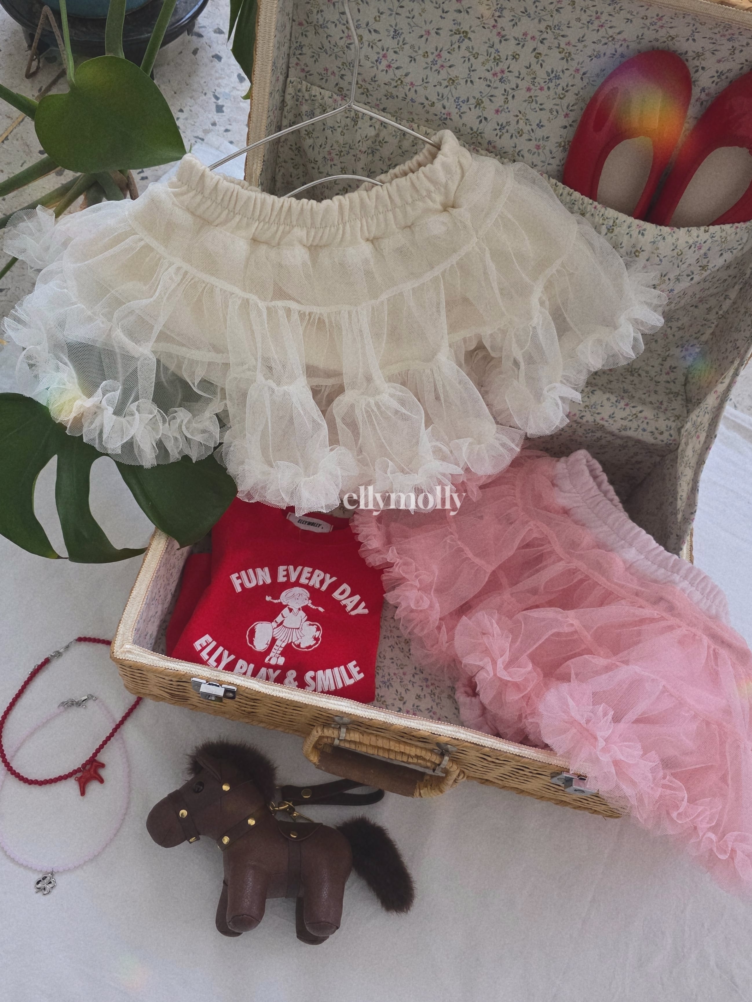 たっぷりのチュールを重ねた、ボリューム感のあるシルエットが女の子らしさを引き立てます。春の光に透ける柔らかな素材感は、穿くだけで特別な気分にしてくれるはず。