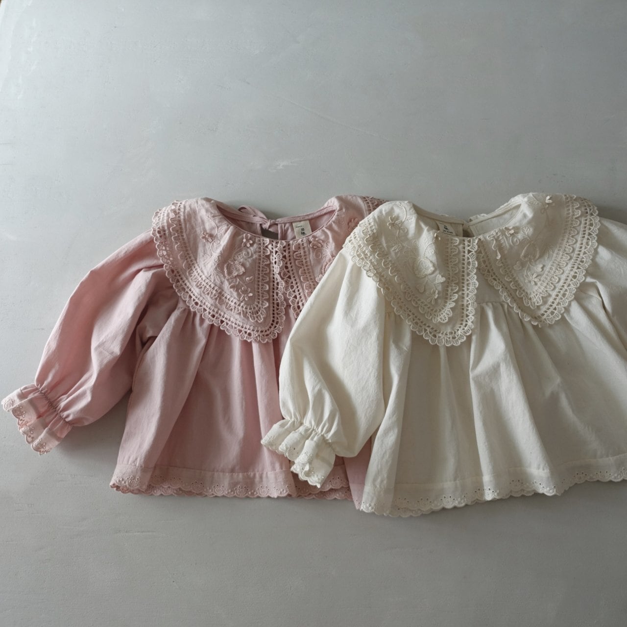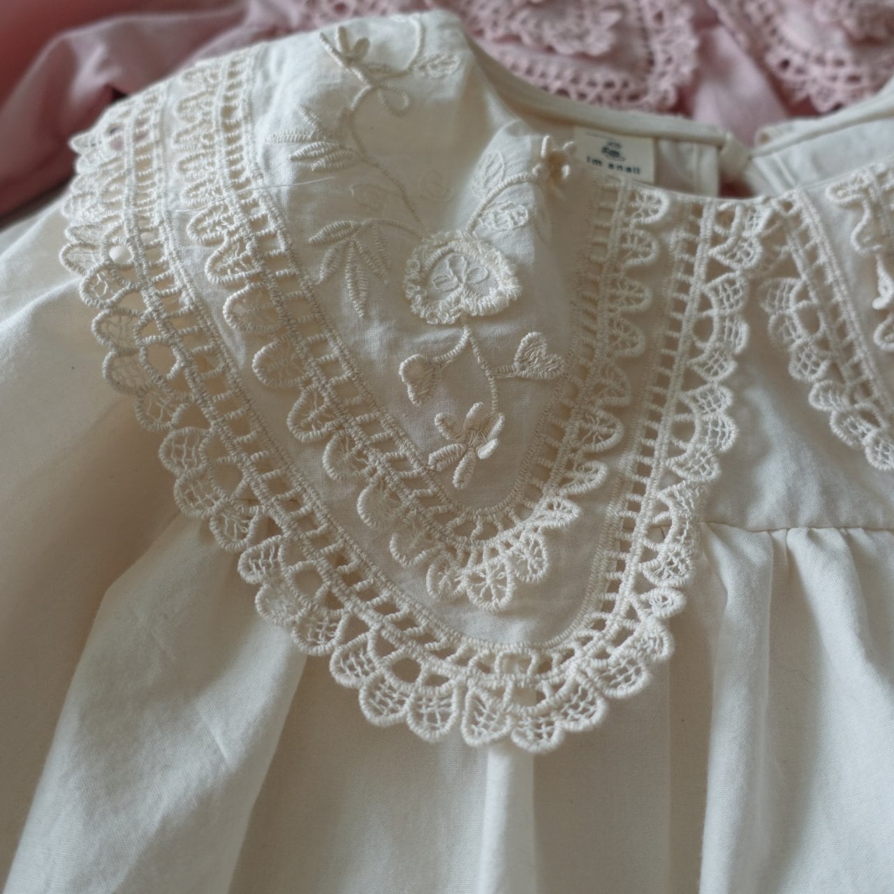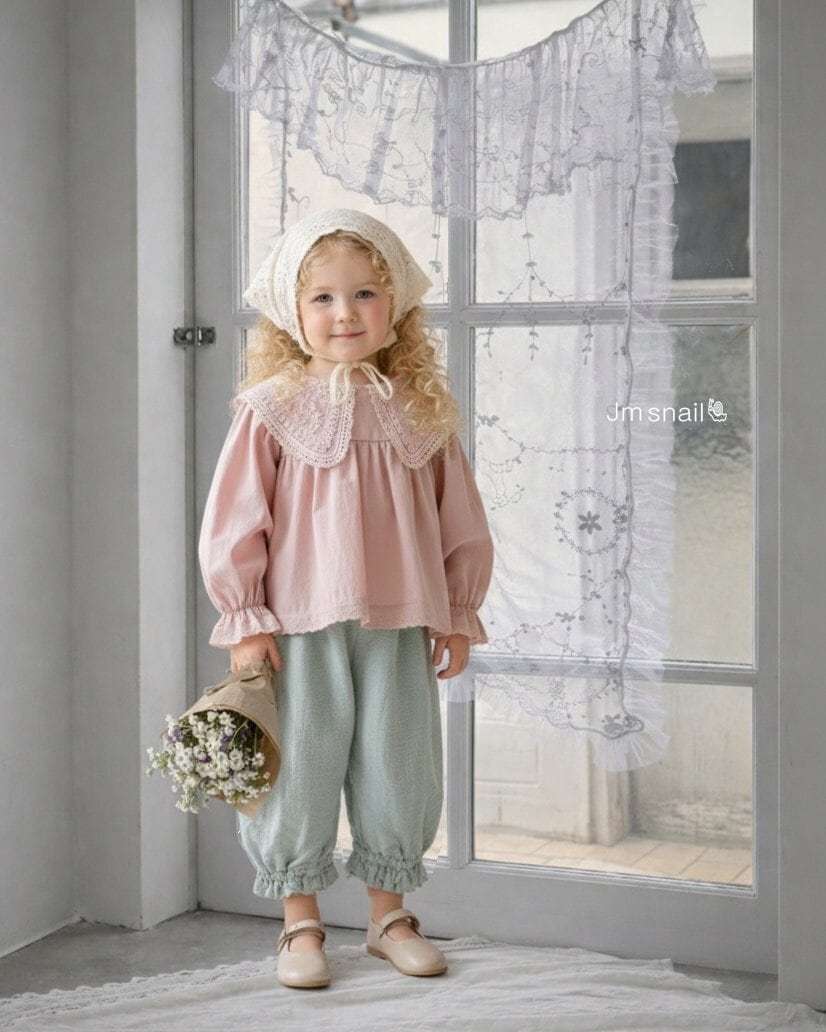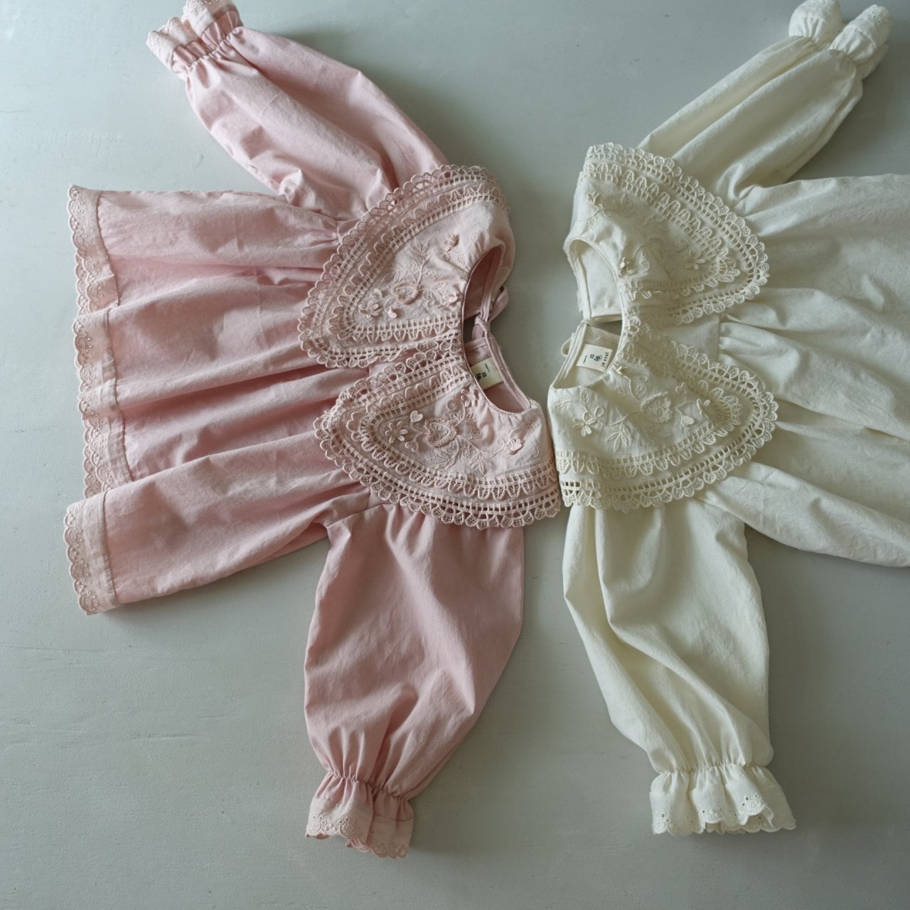繊細なハート模様のレース襟が、お子様のお顔まわりをパッと華やかに、そして愛らしく演出します。広がりすぎない自然なシルエットの襟デザインなので、どんなコーディネートにも上品に馴染みます。